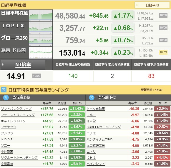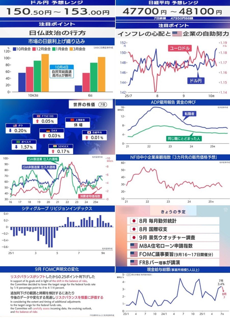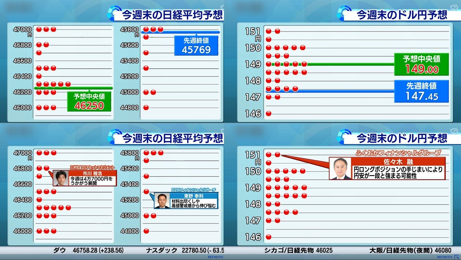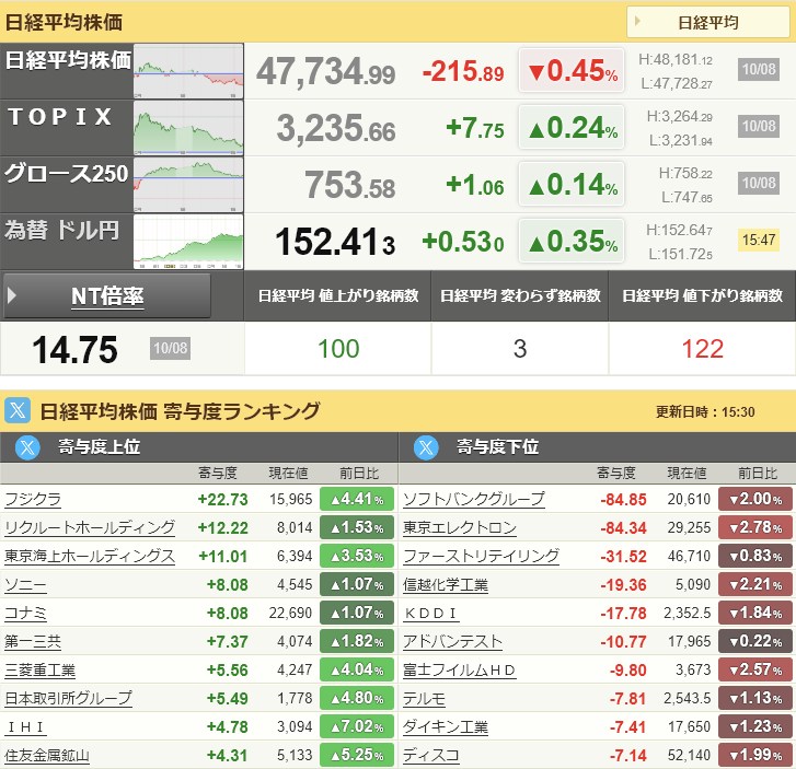さて、高市さんは女性初の総裁おめでとうございます。トップになりたかっただけの石破とは覚悟が違いますね。今まで甘い汁を吸って日本を後退させてきた国会議員は馬車馬のように働かないとこの国を持ち直すことはできませんよ。さっそく馬車馬という言葉に飛びついている馬鹿な政治家が何人かいますが、これに飛びつく政治家は楽をしてきた政治家でしょうなんて思いながら、今週末の日経平均・為替のプロに寄る予想は以下の通りです。