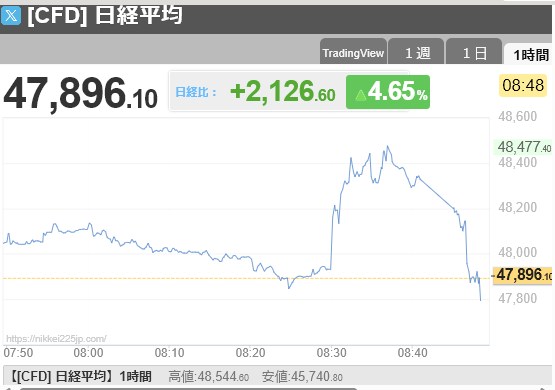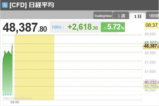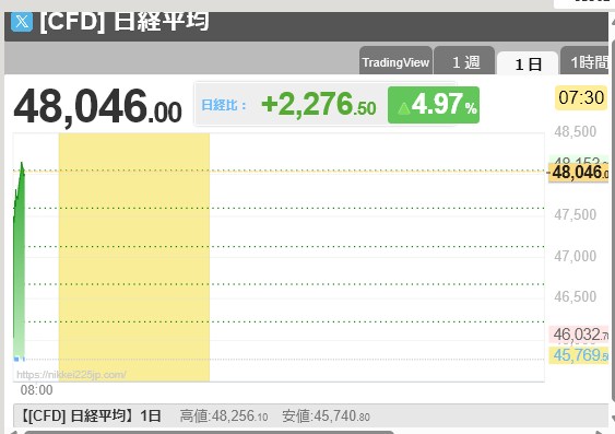高市さんのサプライズ&ご祝儀相場ですね。なかなかすごいわ。勢いがある。もうなんでもありやな。寄与度の高い銘柄で日経を上げていくしか無いね。これワイが買ったら死ねるやつやね。