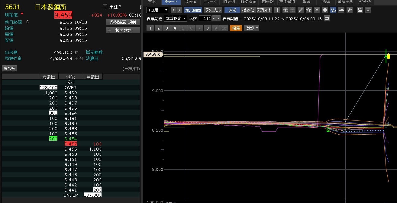 さて、現物の個別の気配が出るまで休憩です。ワイが大幅ロスカットで処分した日本製鋼所<5631>は高市銘柄のど真ん中ですので、大幅高で下手すりゃストップ高もあり得るかもですね。軍事に原発ですからね。まぁ流石に読めないもん。買いを持ち越すなら半導体でしたね。