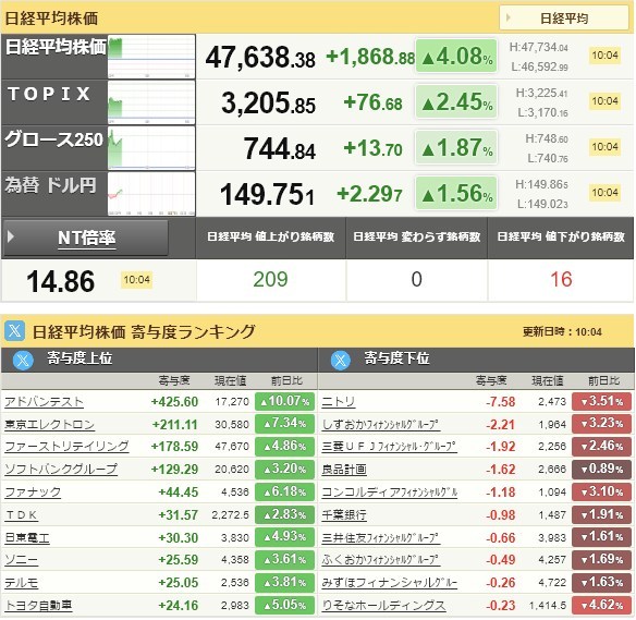 どの銘柄でここまで上げるんや?半導体?ユニクロは違うやろ・・・ってことは半導体か・・・リクルートが正解やったんかな。シンジローが勝っても高市さんが勝っても上がる約束しか無いやん。