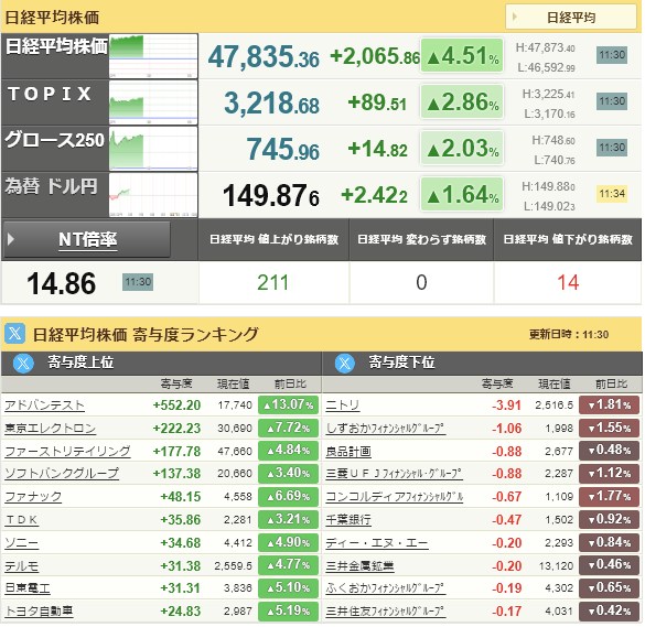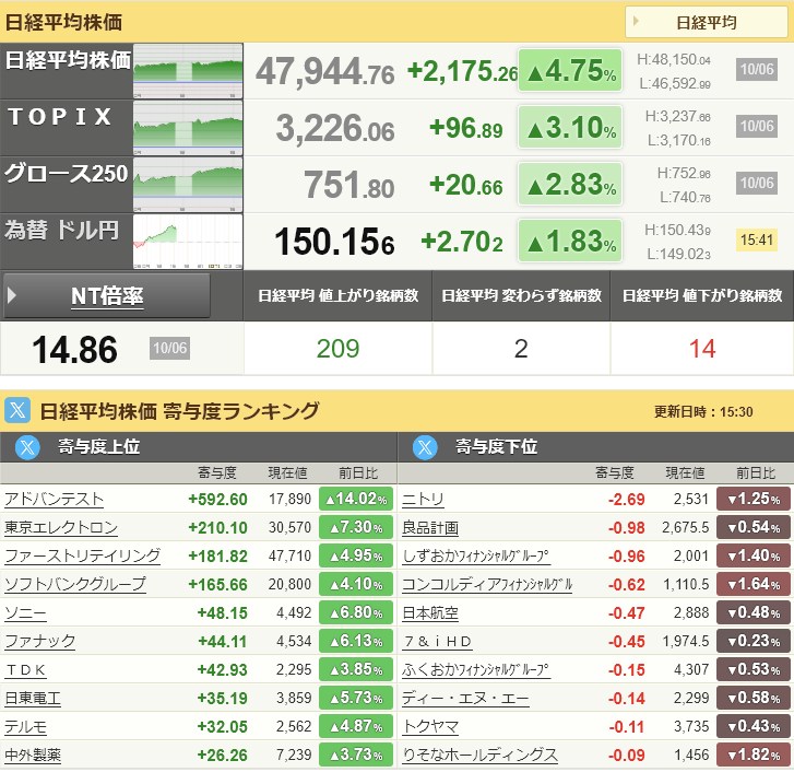 日経平均47,944.76+2,175.26+4.75%[15:45]米ドル/円150.12+2.68+1.82%[15:40]