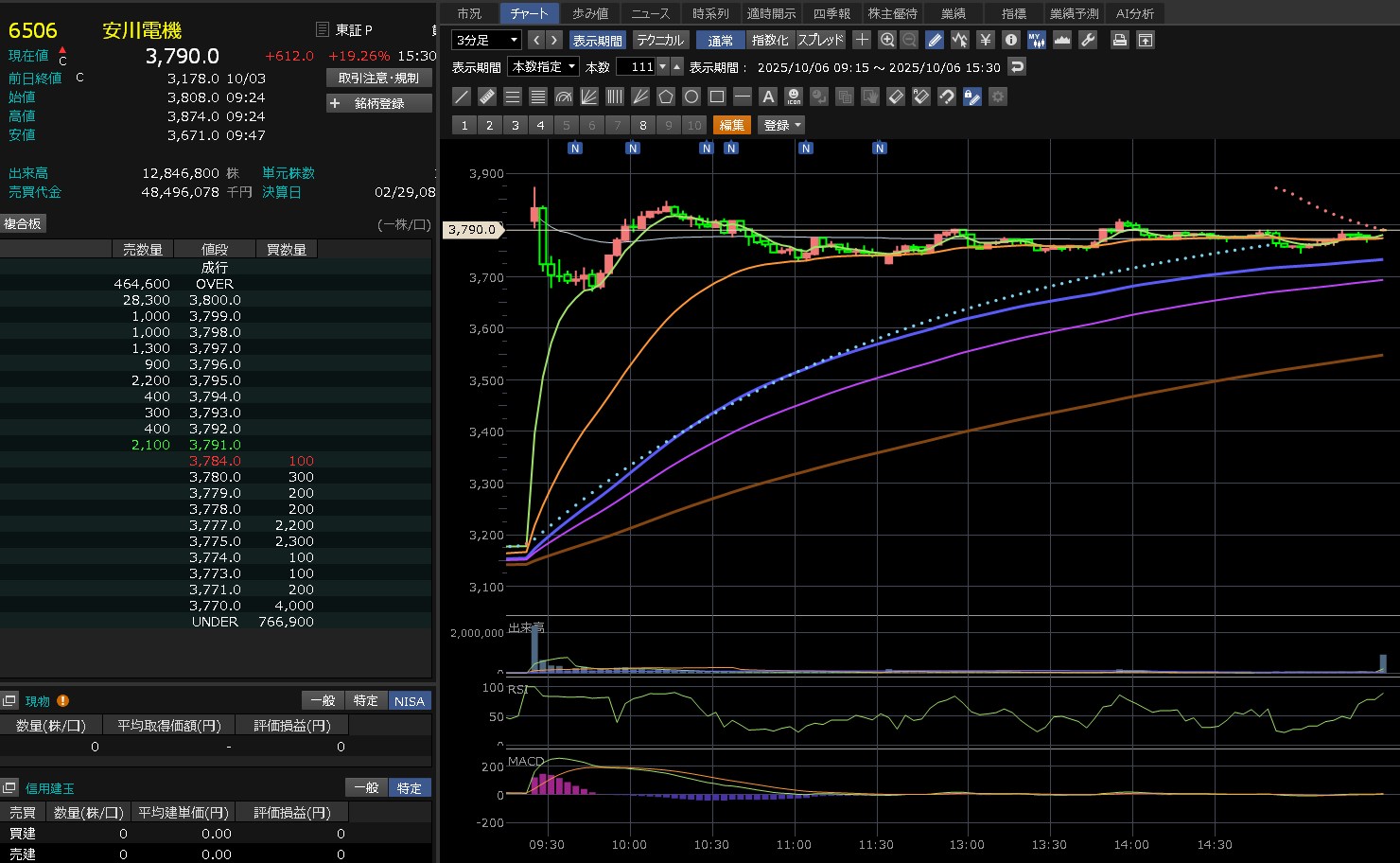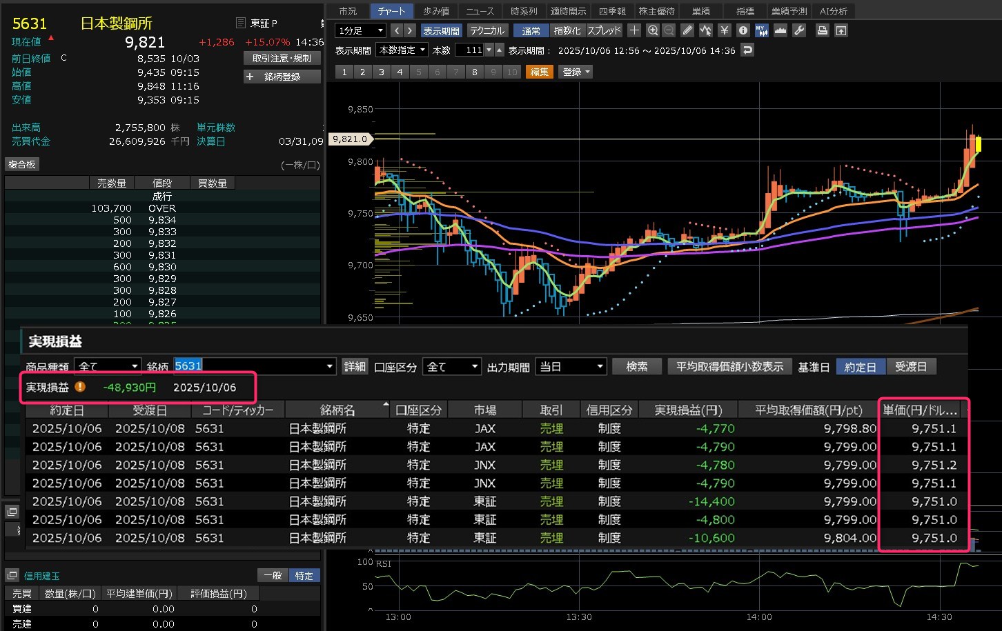 今日はなかなか難しいな。この直近で3000円上げてるんやで!これはね・・・なかなか手が出ない。ただ、トレンドは見る限り上なんですよね。知らんけど・・・昨日は持ち越したら良かったわ。勢いあったからね。にしても日本製鋼所は合わへんな。買ったら下がるし売ったら上がる。なんでやねん。