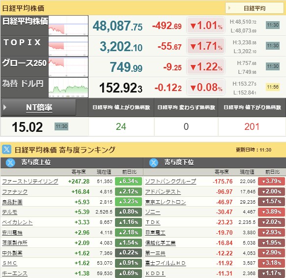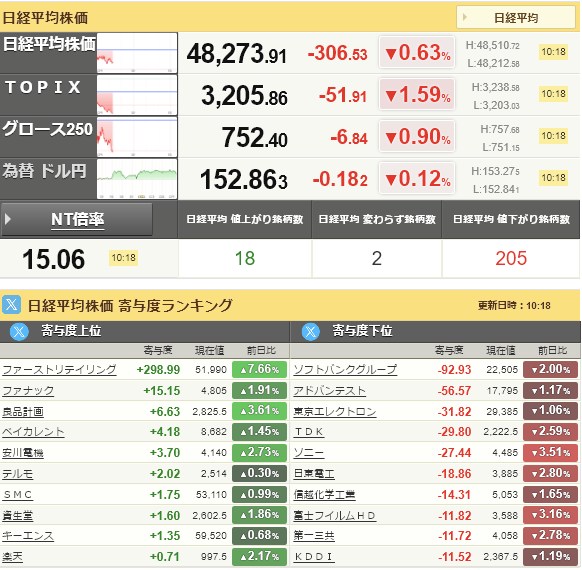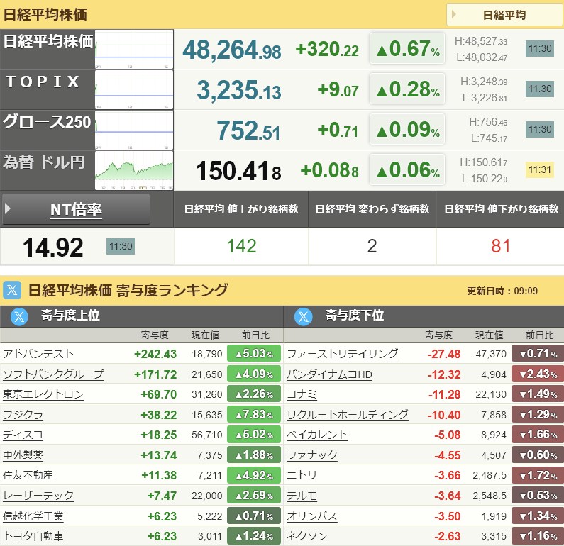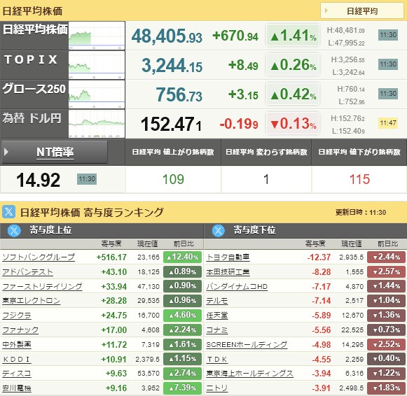 午後1:45から自民と公明が分裂に向けて会談ですね。公明党って岸田、石破のときは政治と金とか言ってこなかったのに高市さんになってから文句を言ってくるってこれなんなん?おかしくない?って思ったりしています。ユニクロの上昇がなければ日経は700以上下落でしたね。