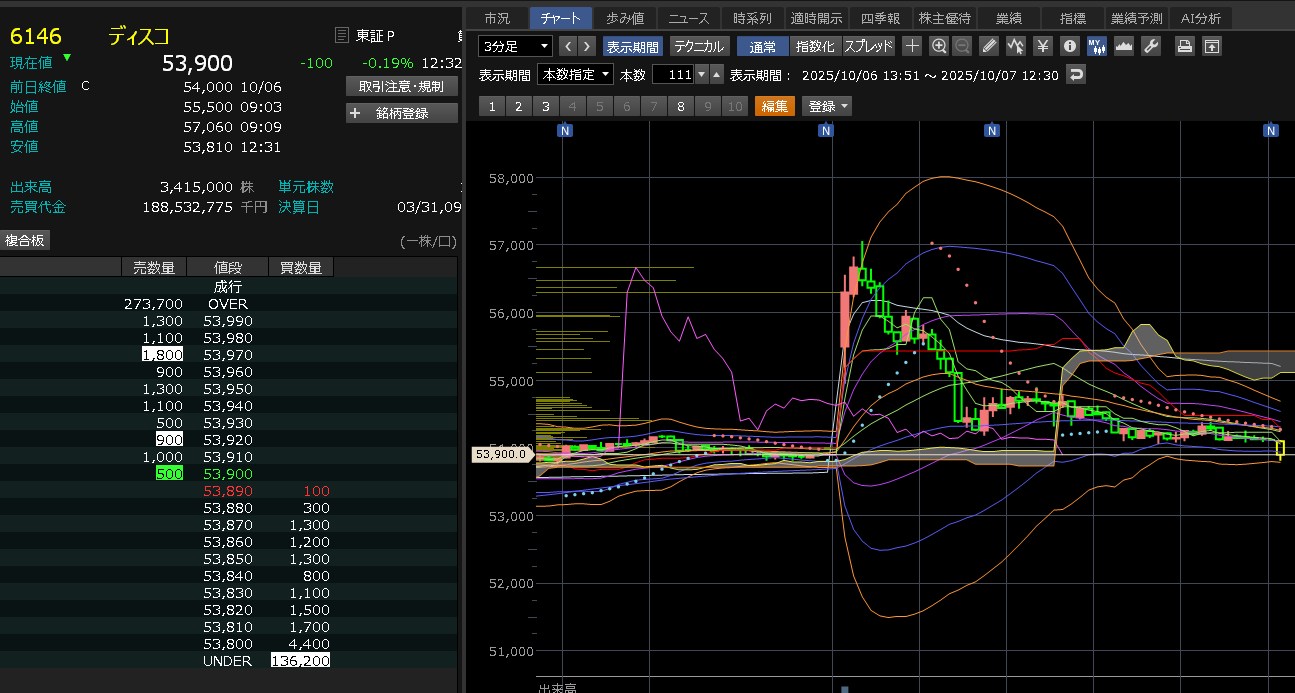 ディスコとか寄りてんやん。こういうのを見てると半導体は後場弱そうやね。買わんほうが良さそうや。空売りは怖いしね。