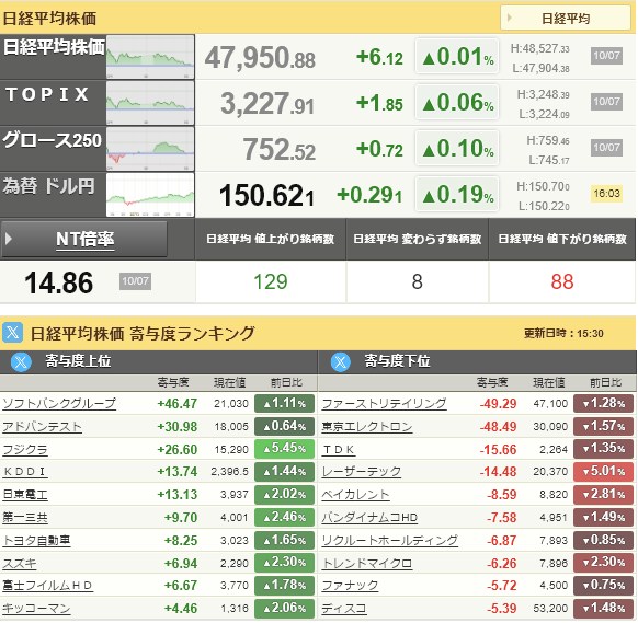日経平均47,950.88+6.12+0.01%[15:30]米ドル/円150.64+0.29+0.19%[15:39]
