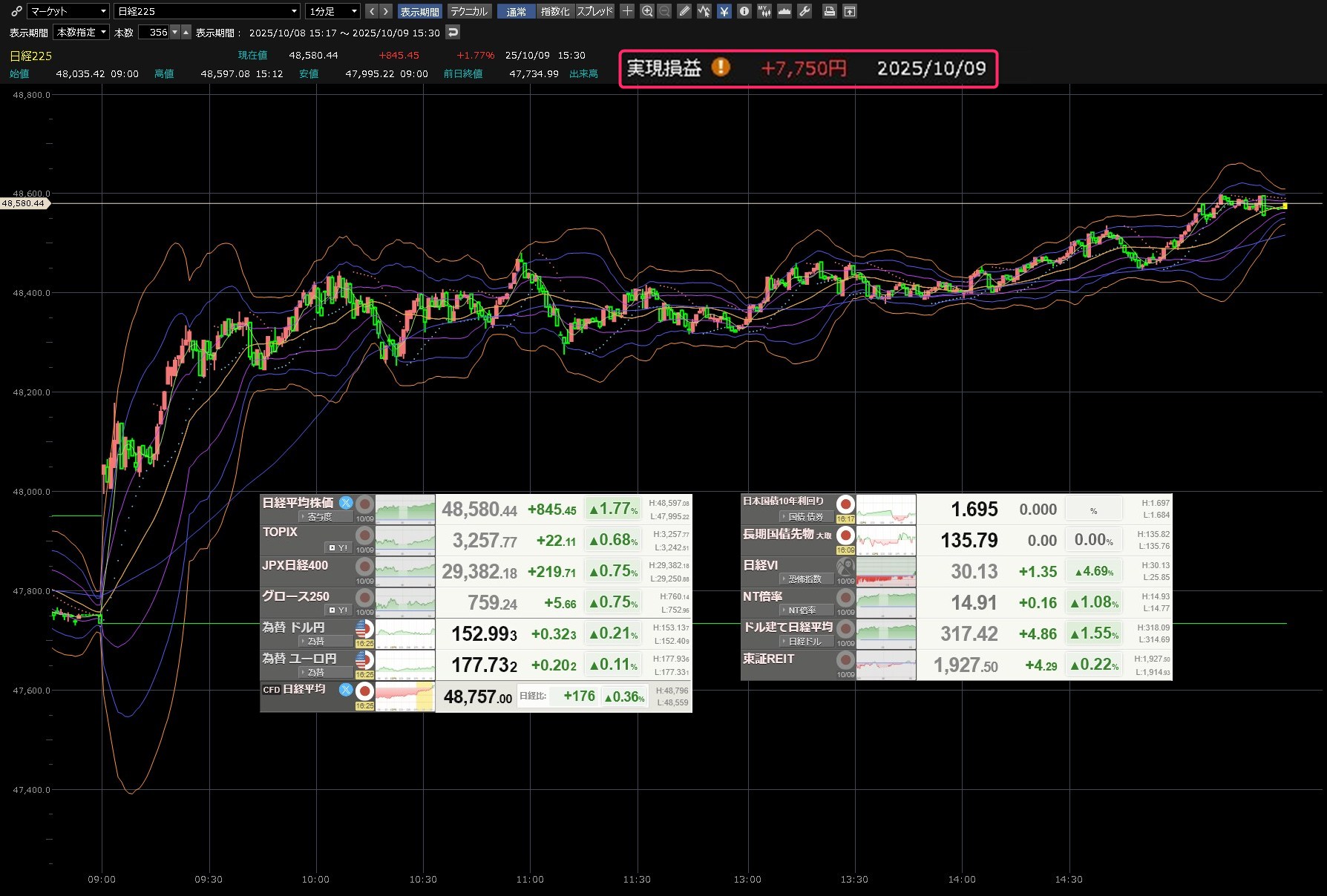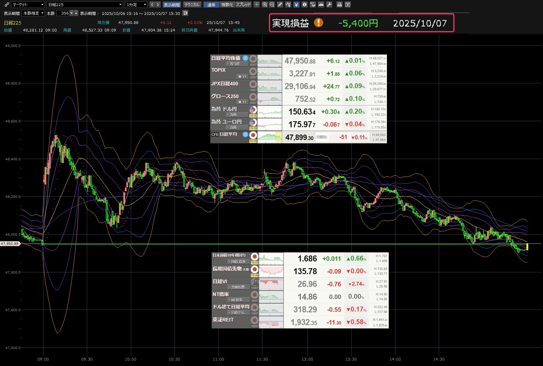 本日のデイトレ結果と日経平均の1分足は以下のとおりです。