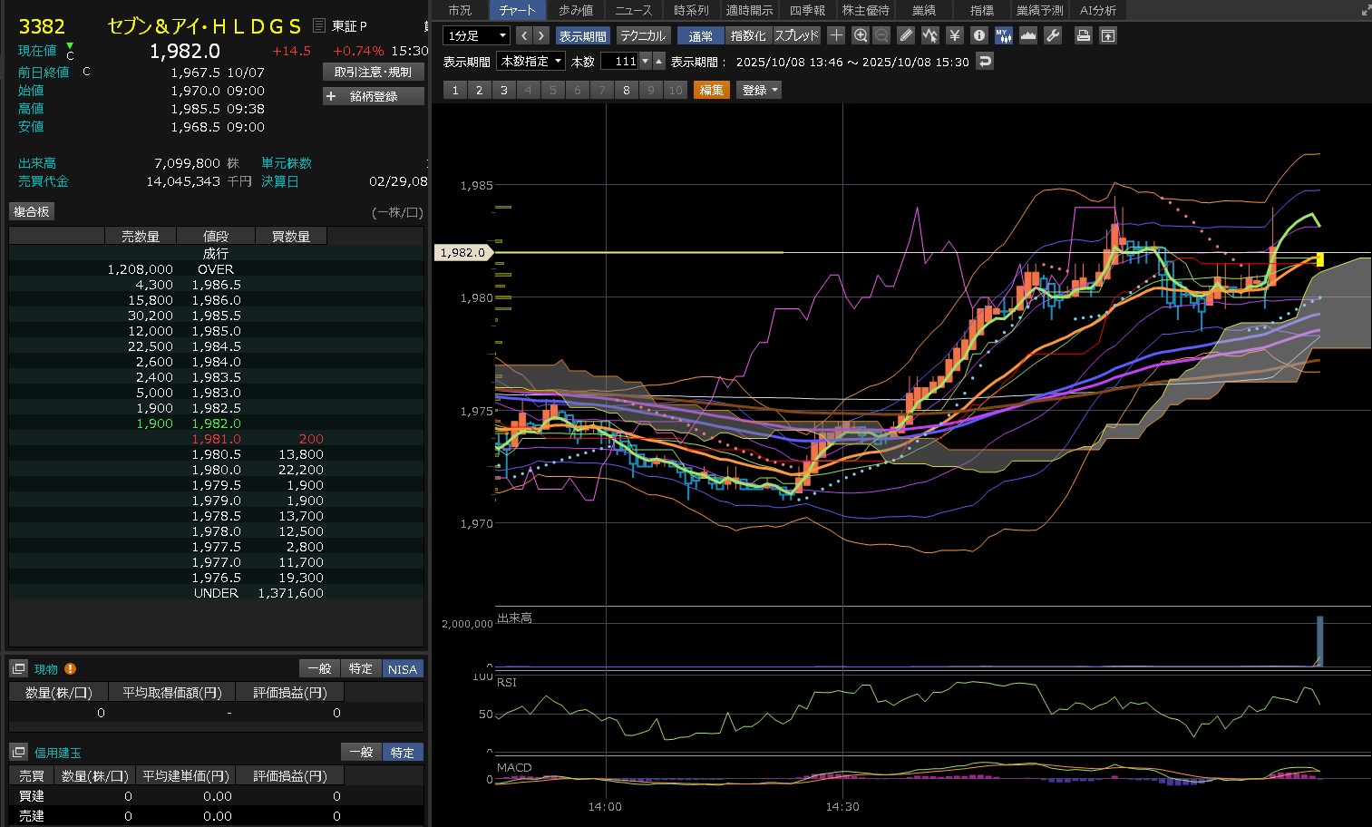 後場が始まりました。久しぶりにセブンイレブンにインしていた。もちろん含み損を抱えていましたが、先程アウトしました。なんだかね。ワイはちょっと迷っているよ。1975になればリバるんですよ。今日のセブンイレブン・・・明日決算だからもう入るつもりはないですけどね。