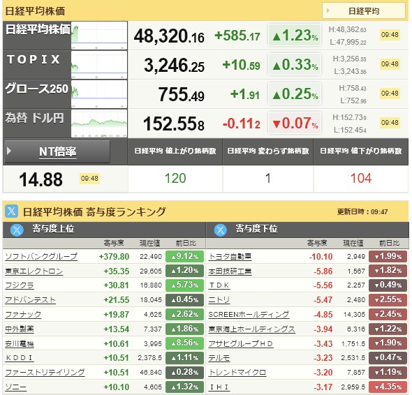 ソフトバンクだけで日経+500近い。日経は現在+650ってことは、もうね。TOPIXは+14やから+0.45%やねん。ってことはあれやね。もうわからんわ・・・スクリンは下げてるし、半導体弱くなってきたし、ロボット系と一部半導体AI系が強いんやな。なんかね。日経は無くしてええんとちゃうか?TOPIXだけでええやん。