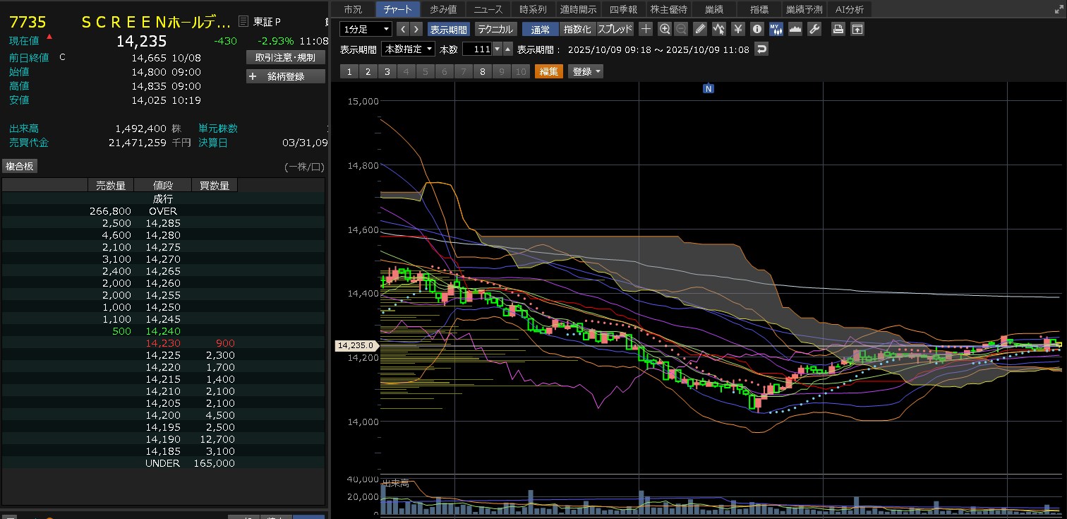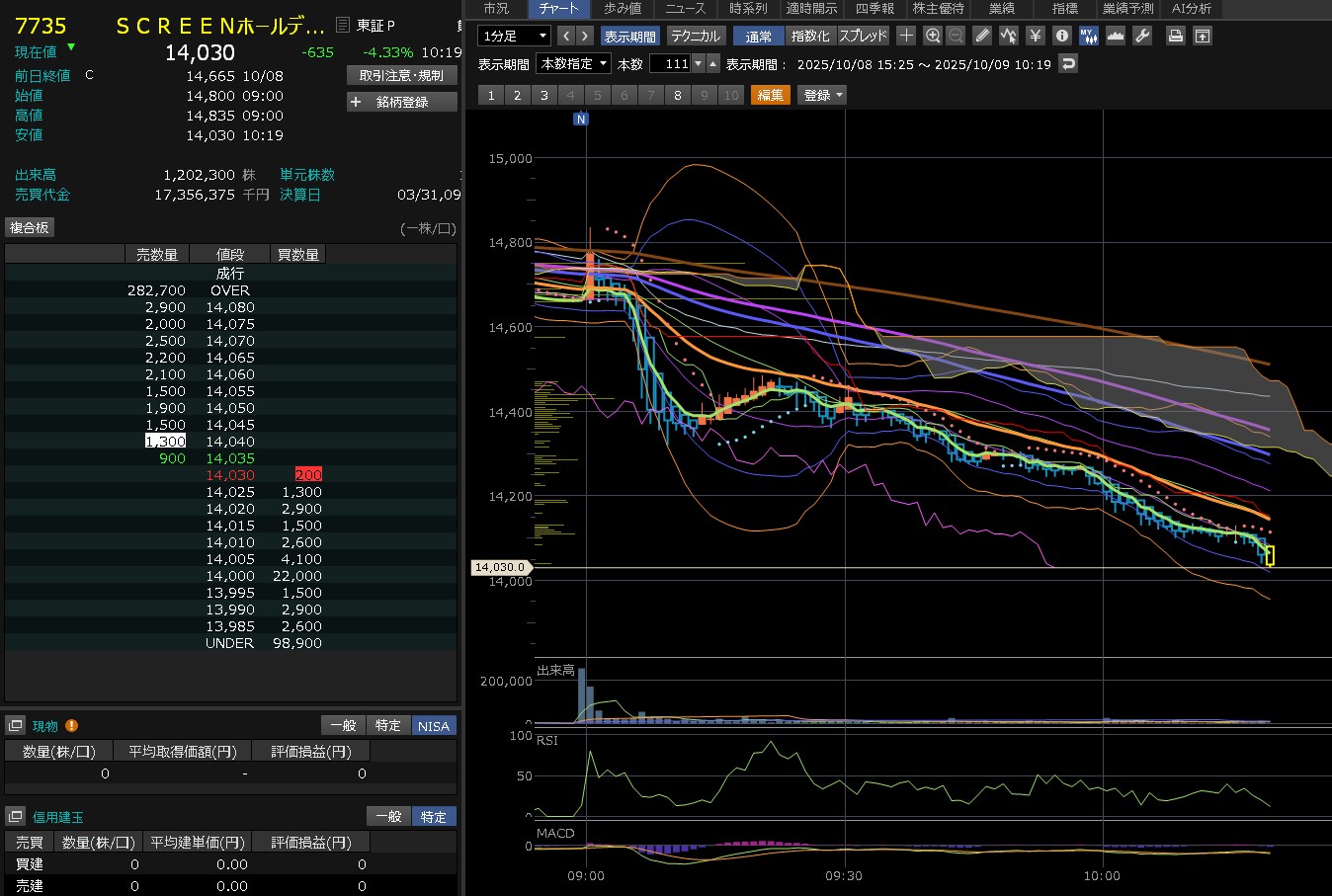 アドバンが怖かったからスクリンを見て空売り狙ってました。でもやっぱり半導体は怖いのよ。14400で売り注文を入れようかと迷いつつできませんでした。現在@14300 まぁこれは偶然なんですけどね。9:46