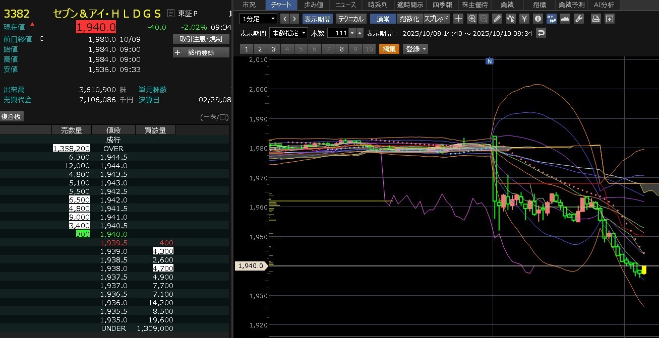 セブン&アイは14:30に入るか迷ったんや。入ったら良かったよ。もうここからは入りません。モルガン・スタンレーのレーティングがありましたからね。浮動株も自社株買いで大分と減ったからね。ただ、明日決算だからイベントは逃げないといけない。