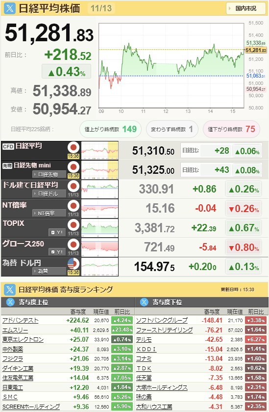 日経平均51,281.83+218.52+0.43%[15:30]米ドル/円154.97+0.2+0.13%[15:40]