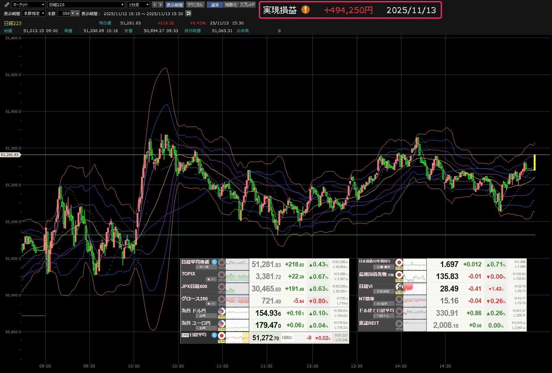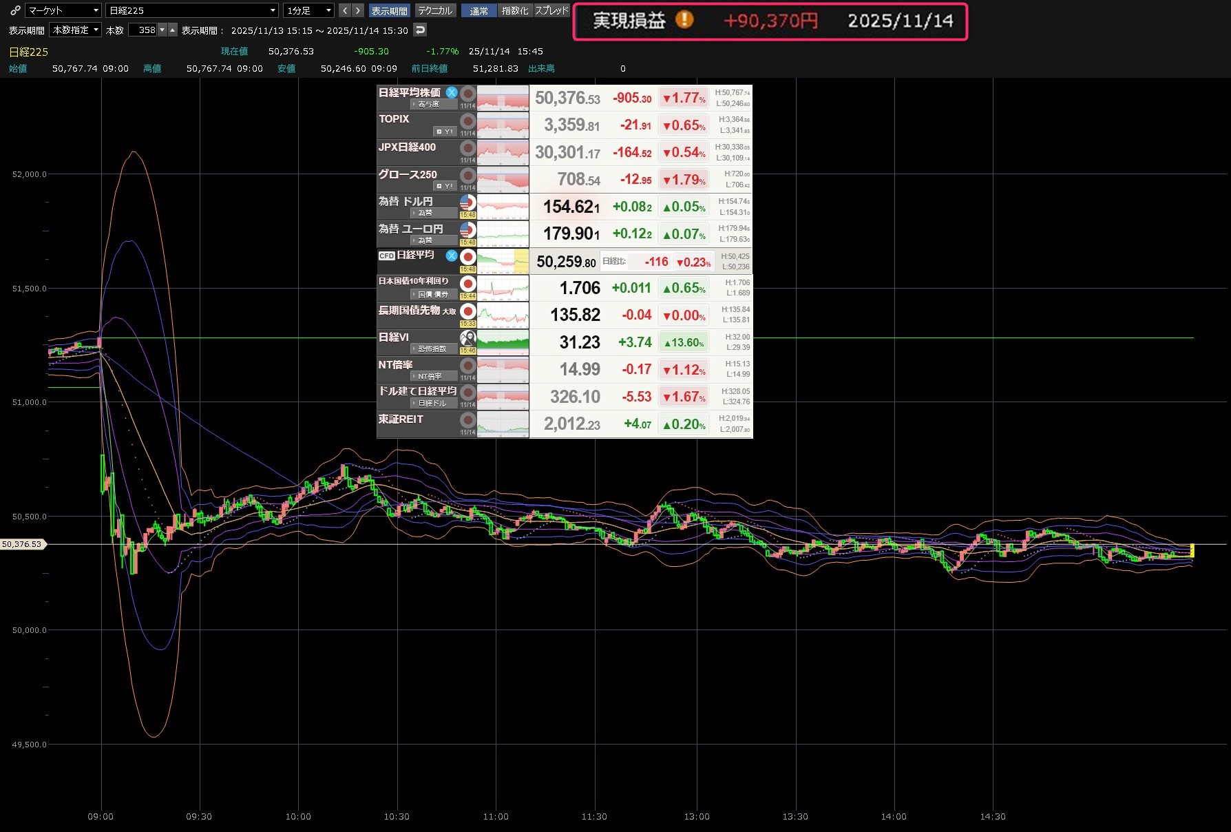 本日のデイトレ結果と日経平均の1分足は以下のとおりです。