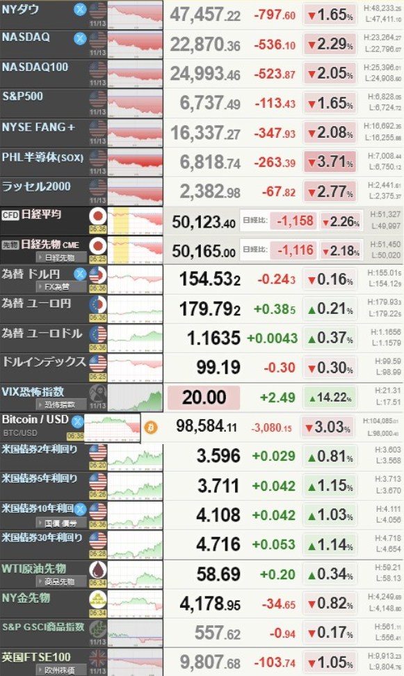 アメリカの政府閉鎖期間も43日間と長かったですがようやく解除されて材料で尽くしで下げたのかと思いきや、ひょっとするとキオクシアがアメリカのAI株を下げたとか?!まさかね・・・さて、気配が出るまで休憩です。