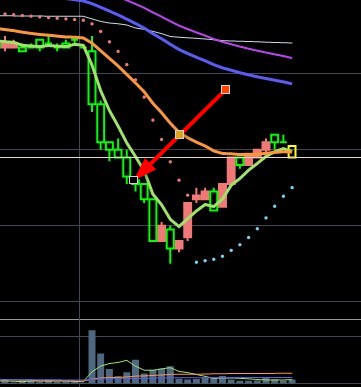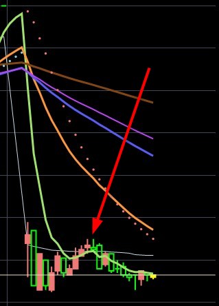はよ節目割り込めやって思いながら見ています。赤い線に沿って落ちていってます。この赤線と緑が交差したところで買うべきでした。( ´・ω・)y-~ エト…残念。ゥヮ──。゚(PД`q*)゚。──ン あ、割り込みました。やはりね。