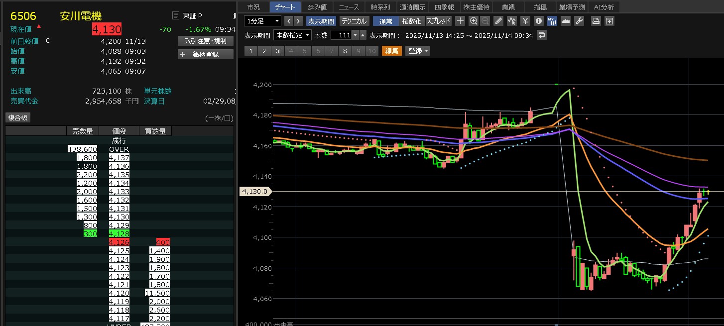 逃げました・・・逃げ切れましたが、引けまで持ってたら良かったね。チャート見てたら買い転換してたから購入したのがまた早すぎたんやね。ずどんときたときにすぐに拾ってリバ狙いするとたいがいそこから落ちていくねん。ほんで含み損。反転確認してから買うべきですね。わかっていてもなかなかできない。安川電気やったんやで!