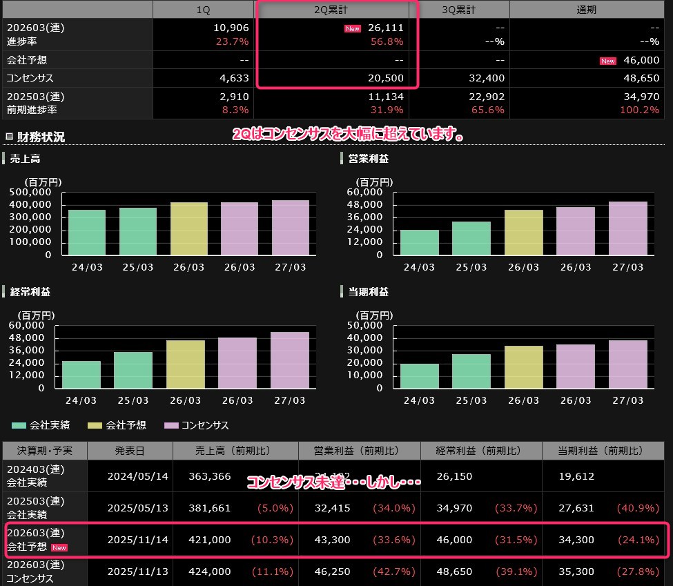 って全然押さないね。4660になれば買おうと思ってるのですが、ってか前場引けでも良いかなと思ってる。この決算はいいよ。きっとSBIホールディングスと同じ匂いがする。あえて落として短期を投げさす動きやで!アシックスでも見た。普通に好決算。この進捗率は半端ないよ。2Qの伸びは半端ないで!