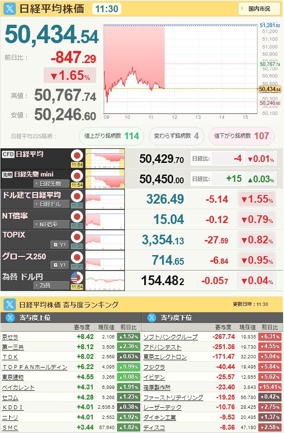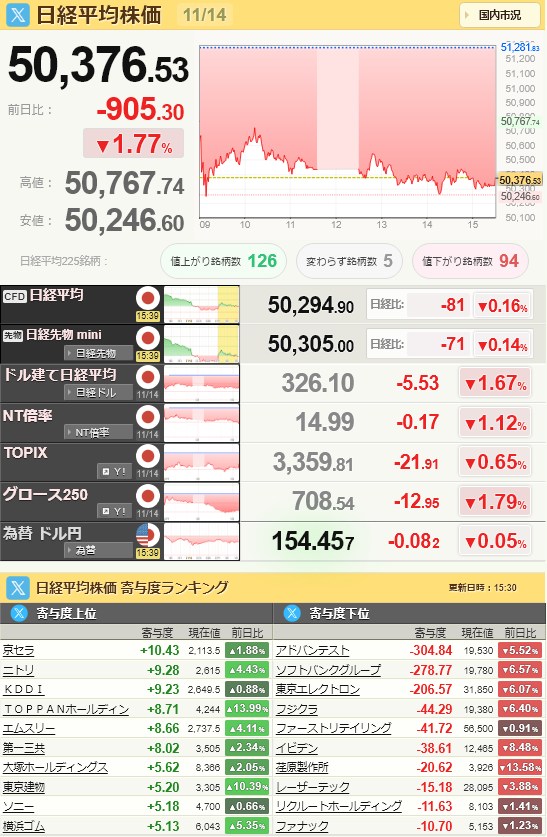 日経平均50,376.53-905.3-1.77%[15:30]米ドル/円154.46-0.09-0.06%[15:40]