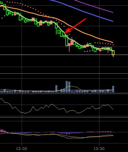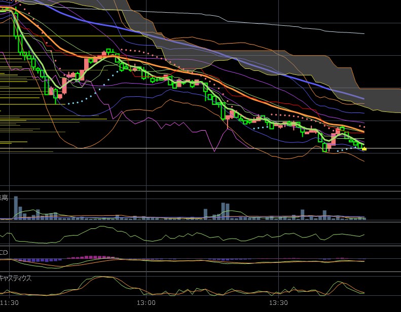 含み損がどんどん膨らんできた。このズドンからまだ下げてるんやで・・・ただね・・・何となくですが14:30がそこのような気がしてきました。おそらく空売りの買い戻しが入ると思っている。なので放置っすわ。