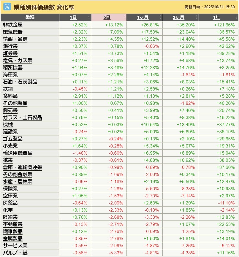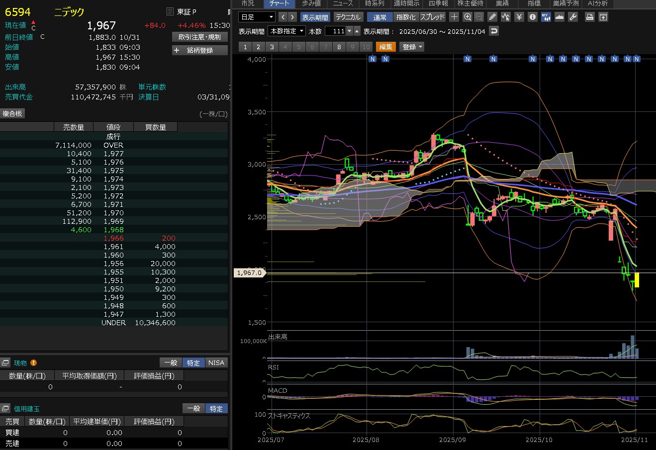 ニデックはもうTOPIXやら日経の売りが10/31に終わったからあとは・・・ね・・・そういうことなんかな。反対にイビデンは下げてましたからね。株は受給やで!ここからニデックは買われそうな気がしなくもない。いい会社やもんね。買わんけど・・・本日も乙でした。明日も相場を楽しみます。なんもできひんわ。