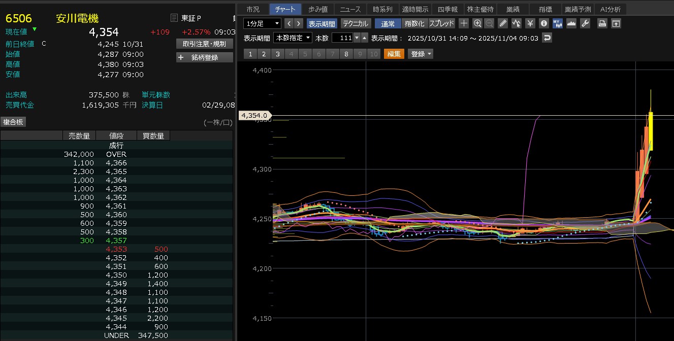 ファナックと安川連動やね。おんなじ動きしている。だからこそ、早く寄った安川を買うべきでしたね。アホしました。だって怖いやん。日経がぐんぐん下げてきました。ただ、強い銘柄は強いと思うねん。今日の日経の下げはアドバンやね。