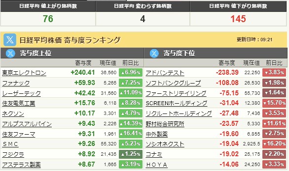 完全に半導体が逝ってるね・・・観光の下げのほうがきついわ。まぁあれだけ上げましたからね。みんな逃げたいんや。これは前場引けに空売りしたら儲かるパターンやね。日経▲888円安やわ。任天堂が寄って、+8%以上の上昇やわ。アドバンが寄った。ワイの予想では寄り底なんやけどどうやろう?