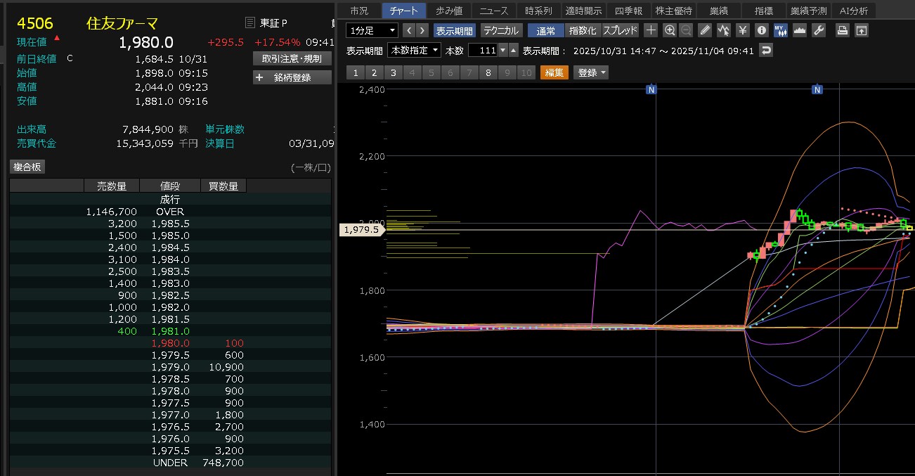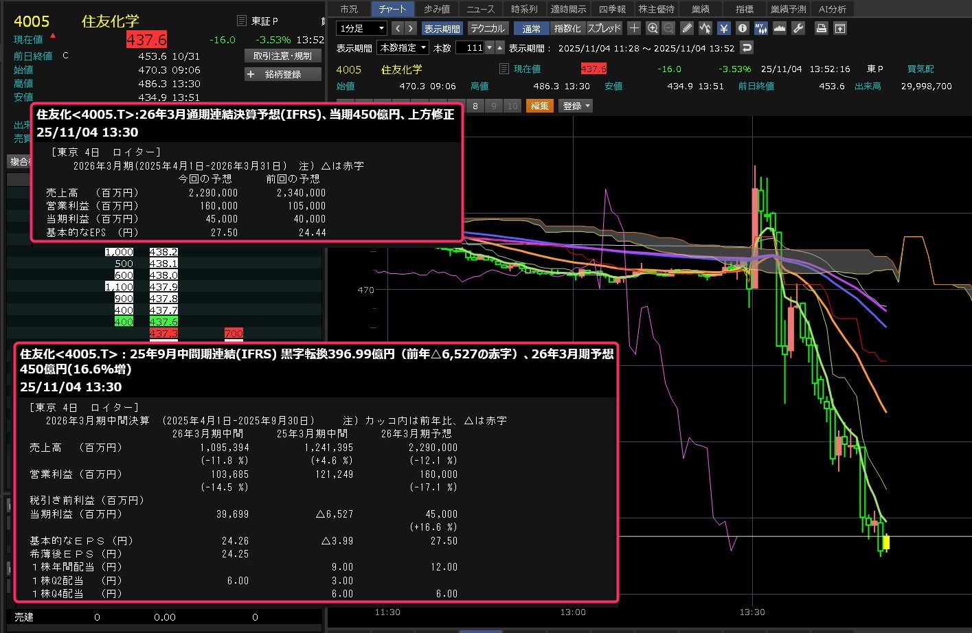 住友化学も織り込み済みやね。落ちていってるわ。これは明日は上げるかも知れへんね。一応は上方修正やもんね。知らんけど・・・ワイの買った株はどんどん下げてるけど、14:15ぐらいになったら追加購入するで!引けにロスカットする。