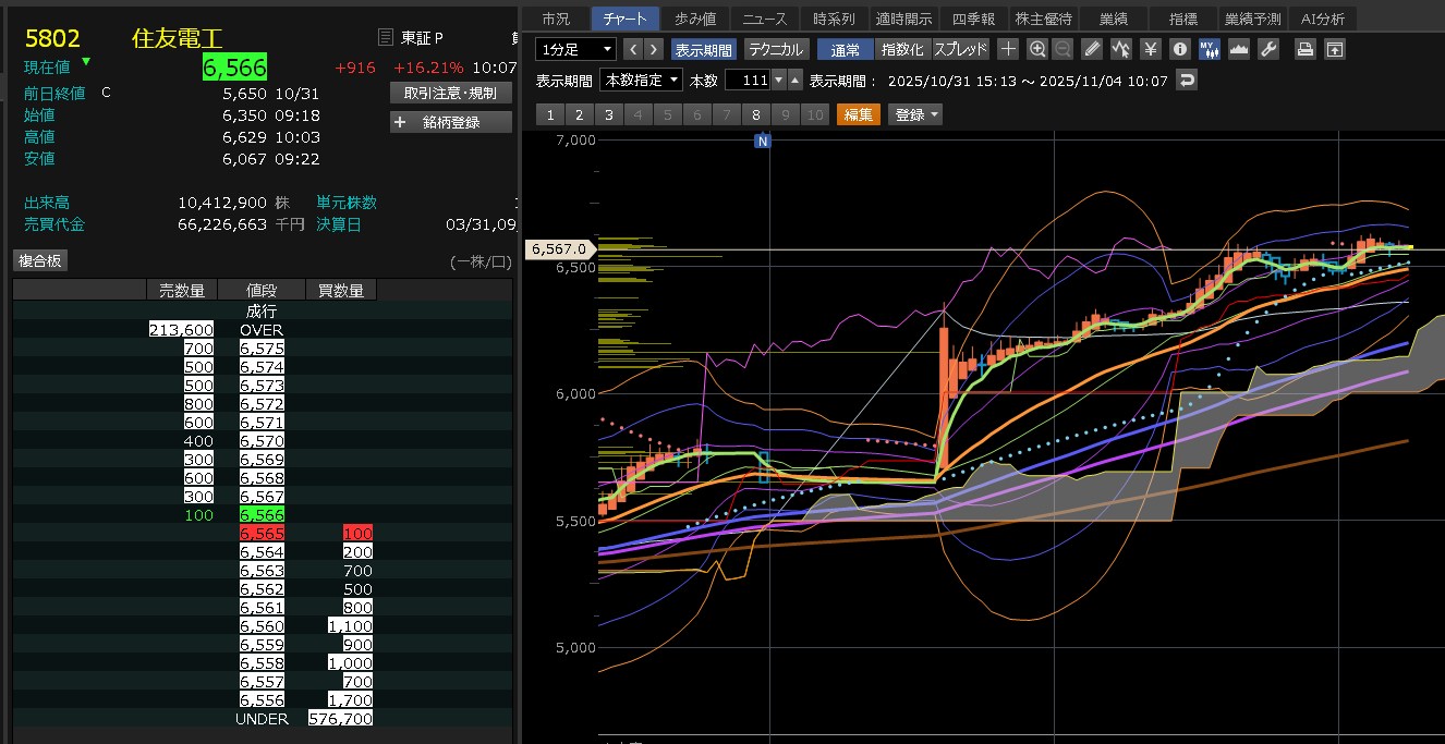 ロスカットが遅れたね。本当にやっちまったよ。もういい・・・持ち越す・・・仕方がない。テーマ株なのでそのうち吹くと思ってる。まだまだ上がるっしょ。過去に8000円もつけたことがある。2007年ですけどね。現在4250未満です。引けに追加で買うよ。絶対上げるはず。ただ、今はチャートが悪いので見てるだけにする。13:30の住友化学の決算までゆっくりするで!