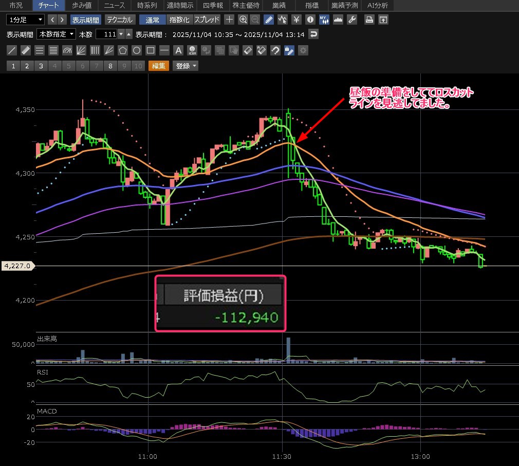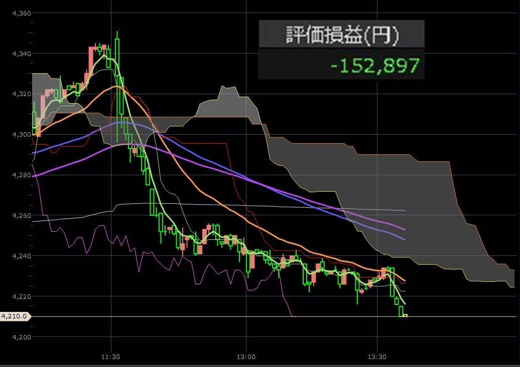 含み損が10万超えたわ。あっという間やったね。さて、今日はもう何もしないわ。これをこのまま持ち越します。やってしまったな。後場寄り付きで売るべきでした。これはMUFGが空売りしてるのでしょうね。モルガンかな。でもね。今はモメンタムが下なのでそのまま見ていきますよ。