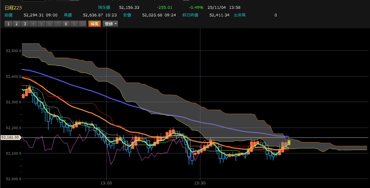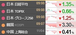 今はすべての線が下を向いてますので買うべきではない。ロスカットも遅れたので、以下に逃れるのかを考えながら取引をしていきます。まぁ個人的には持ち越す予定です。ただ、以下に傷口を広げないようにするのかですね。日経は13:17です。ココが一旦の底のような気がします。それにしても韓国がごっつ下げてますね。2%近い下げです。ってことはハイテクが弱いって言うことですね。