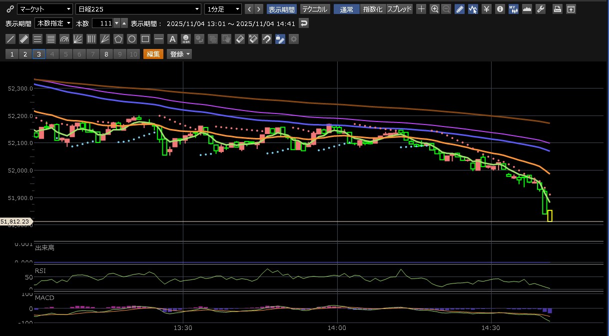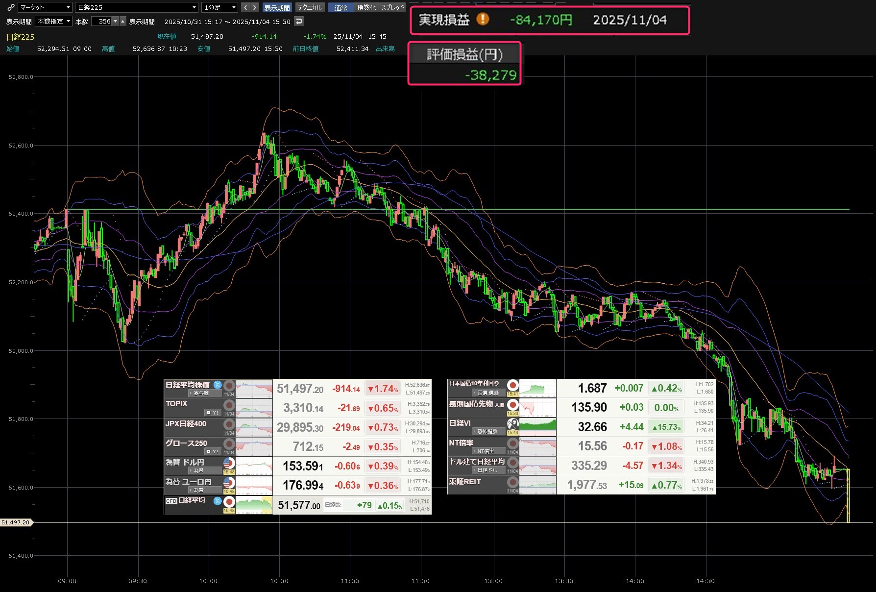 本日のデイトレ結果と日経平均の1分足は以下のとおりです。