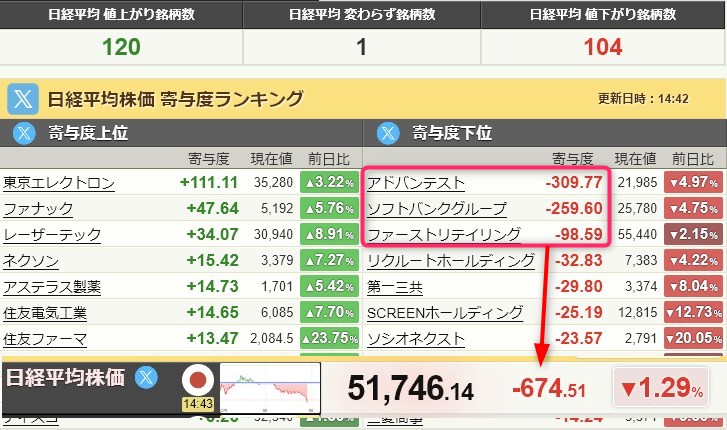 ソフトバンクとアドバンで750円近い下げ、ユニクロで130円近い下げ・・・ホンマに日経のお目汚しやんけ・・・