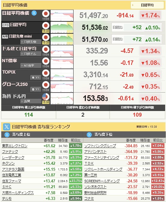 日経平均51,497.2-914.14-1.74%[15:45]米ドル/円153.56-0.65-0.42%[15:50]
