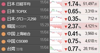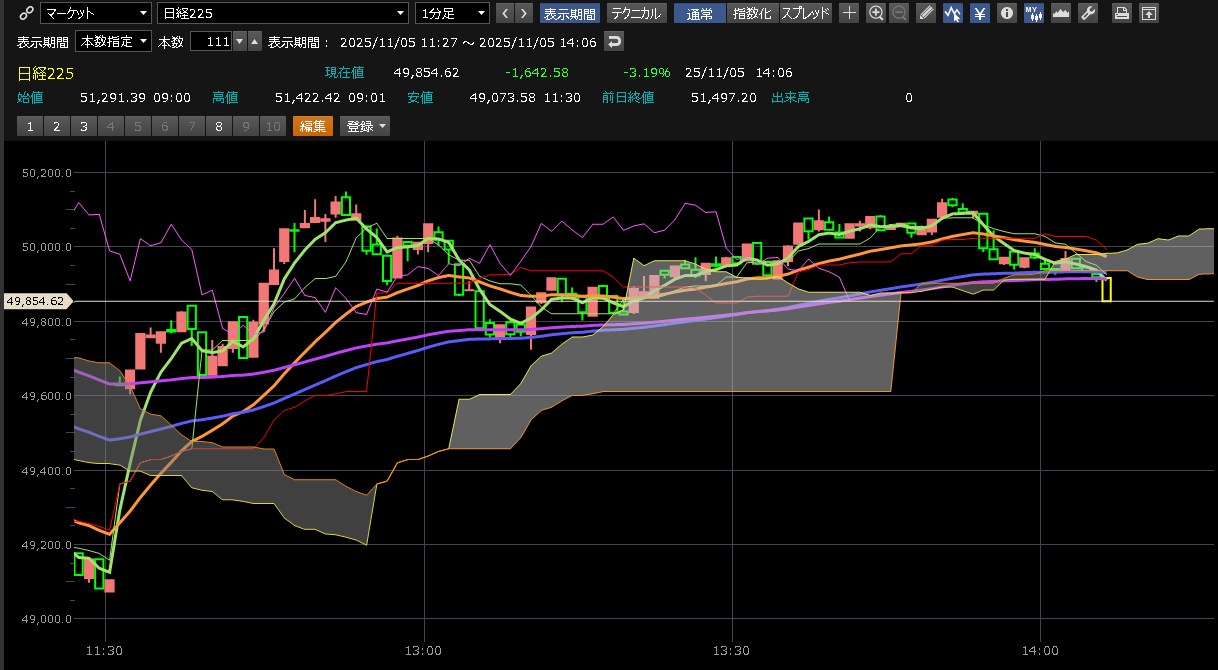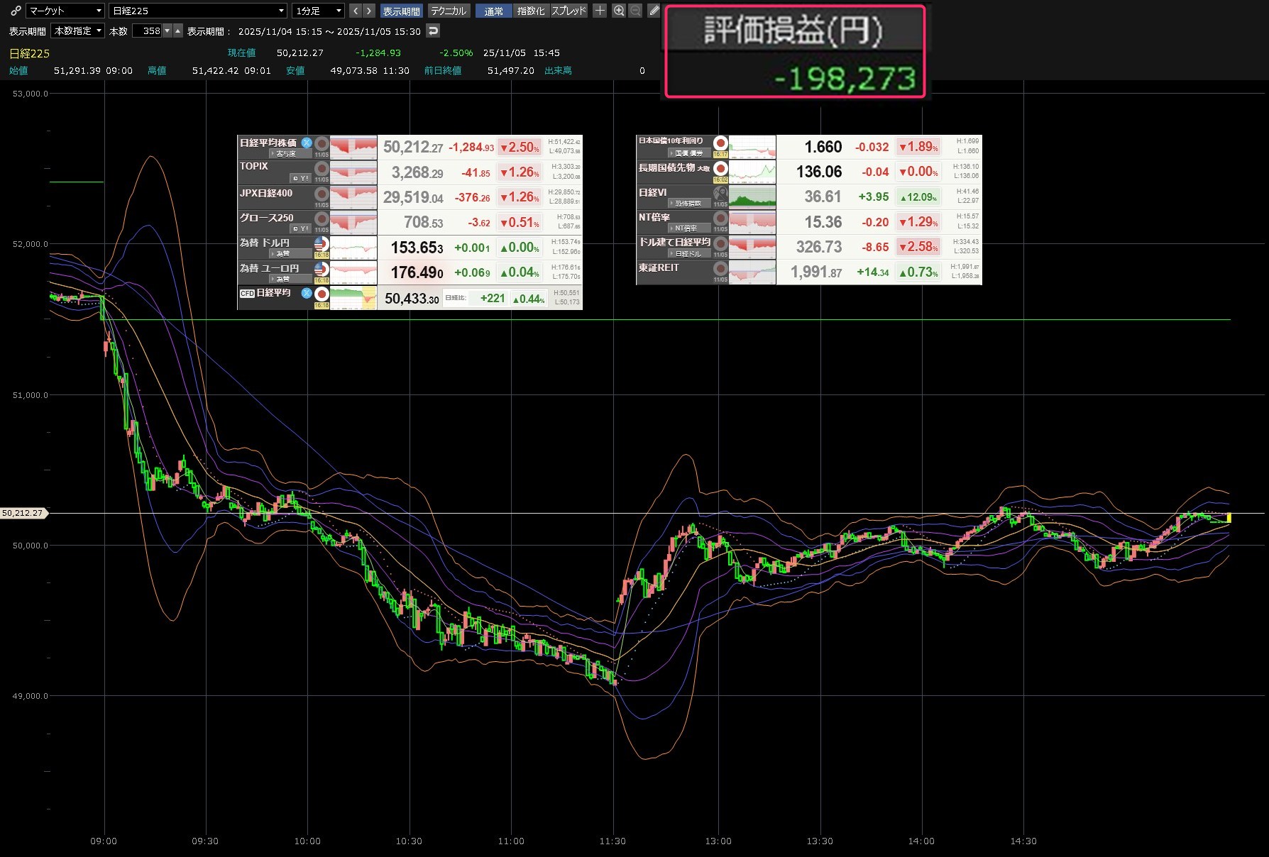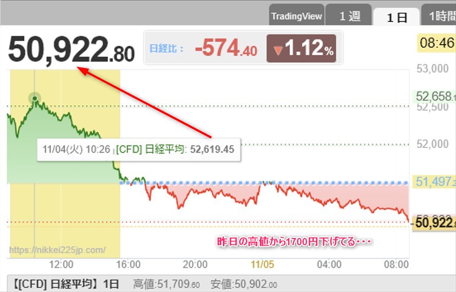 下げが加速してきた。日本株は振れすぎなんよ・・・今日は何もできない。ただただ、吐きそうなだけ・・・日経は▲1400ってね・・・この間まで、昨日52600つけてたのに・・・いま50050です・・・2500以上2日で下げたわ。あと1000円落ちたら10月で上げた分の半値押しやね。もう知らんわ。5万割りそうや。