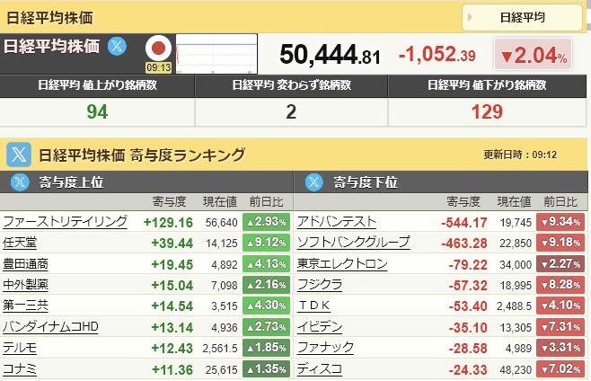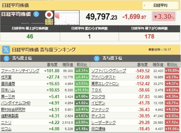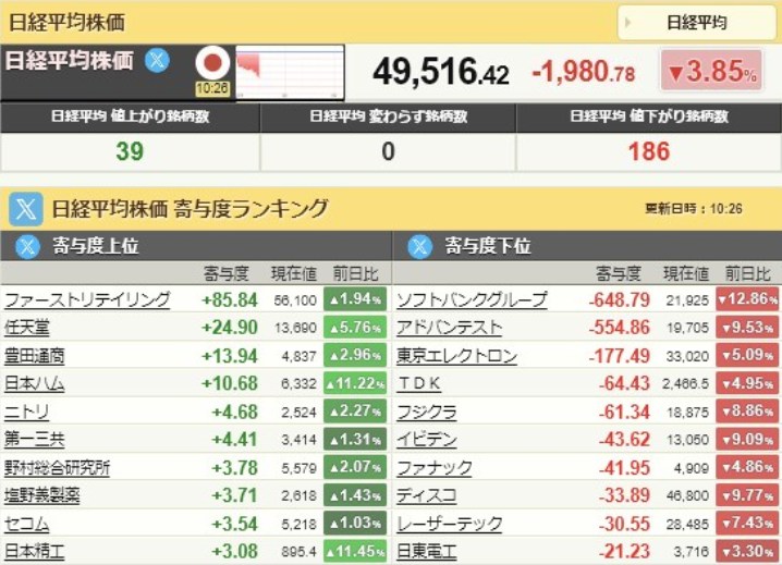 後場はリーマンが売ってくるから、引けに売るのか思案中・・・信用買いが多い銘柄が狙い目ですね。知らんけど・・・本当に知らんけど。。。悔しいわ。2日で3000円の下げ・・・なにこれ本当に・・・あと5分っすね。引けにかけてズドンがくると予想します。韓国はマイナス6%からリバってきてるのに(現在▲4.41%)日本はずんずん下げて韓国の下げを抜いたわ・・・▲4.62%ってね。49000も割り込みそうやんけ。今日だけで2400下げてるやんけ