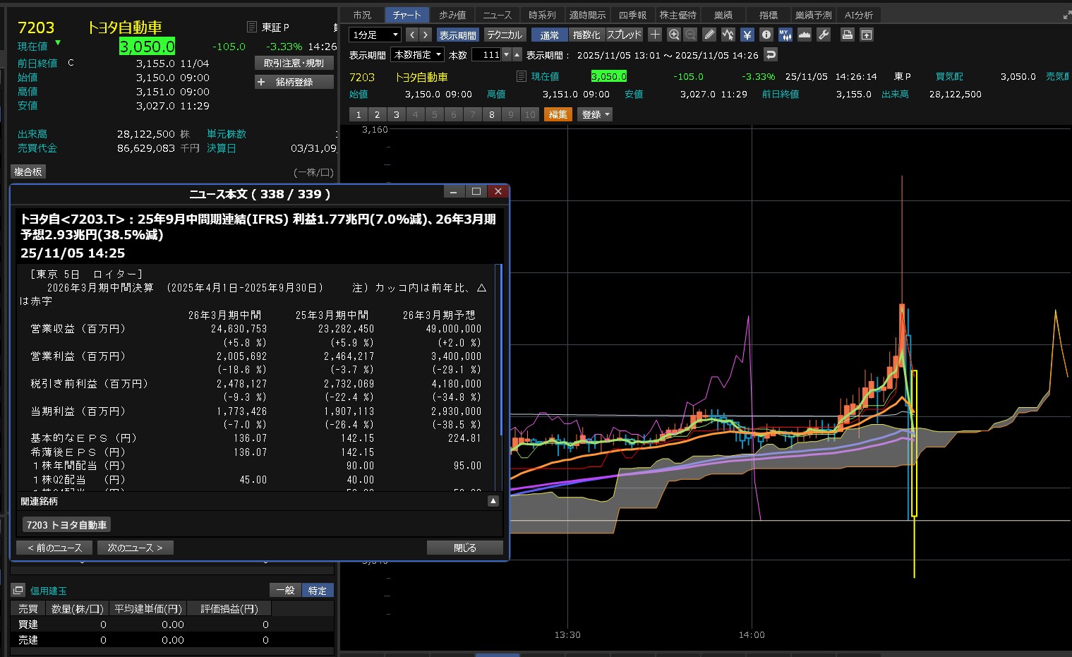 トヨタの決算発表で日経が下げてきた。でもまぁこれは明日は上げる決算でしょう。