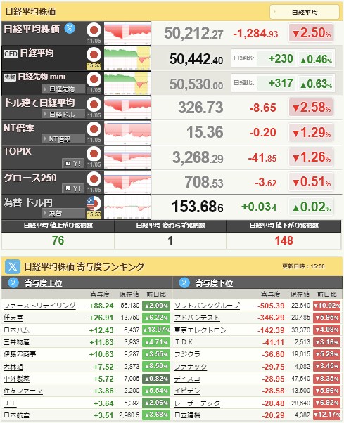 日経平均50,212.27-1,284.93-2.5%[15:45]米ドル/円153.68+0.01+0.01%[15:49]