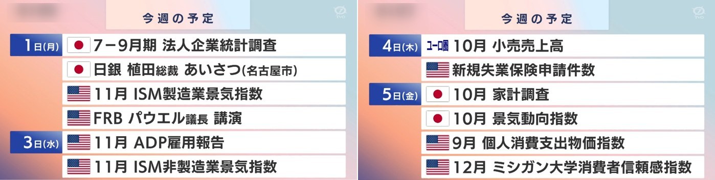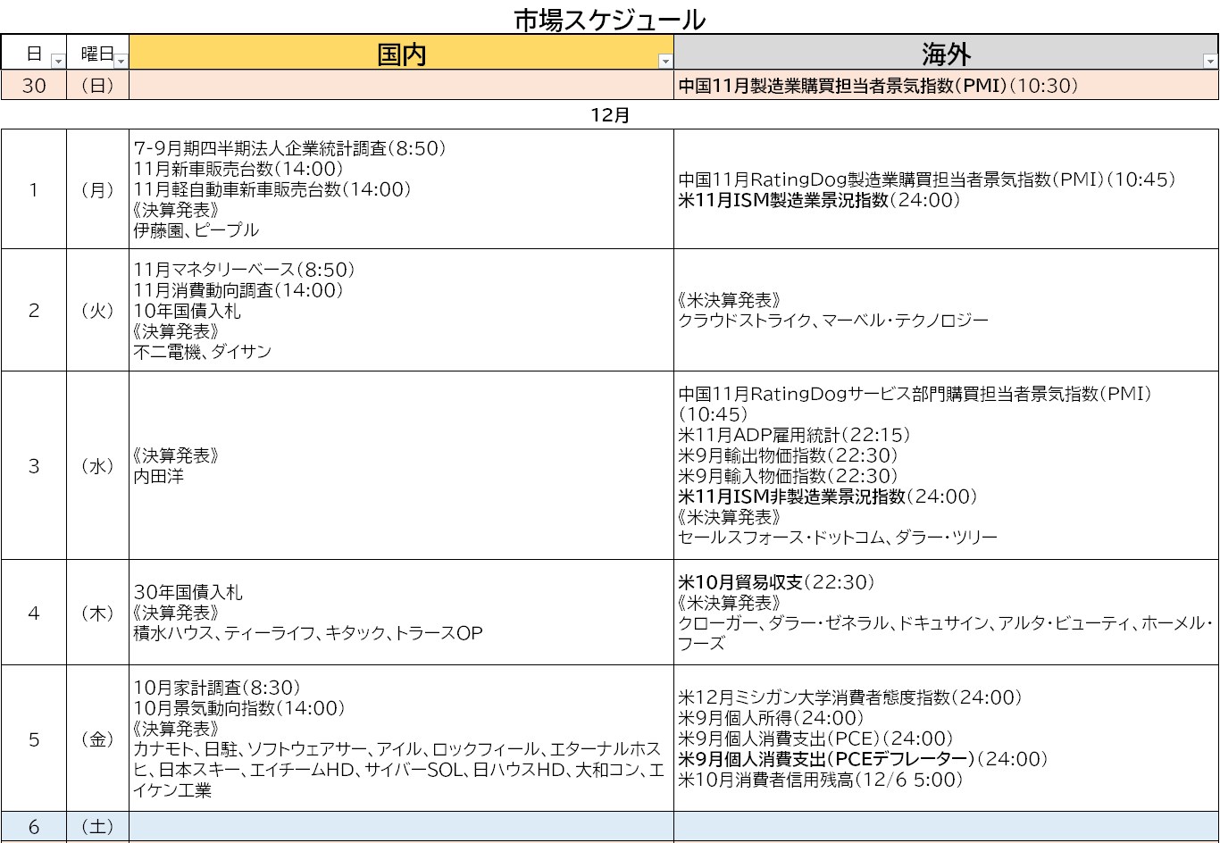 波乱の11月が終わって本日から12月です。祝日が3日の月って5月と11月がありますが、今年の11月は四日新甫でした。二日新甫は荒れるといいますが、三日もそうなのでしょう・・・それが四日となれば大荒れだなって先月を振り返りながら、今週の予定は以下の通りです。