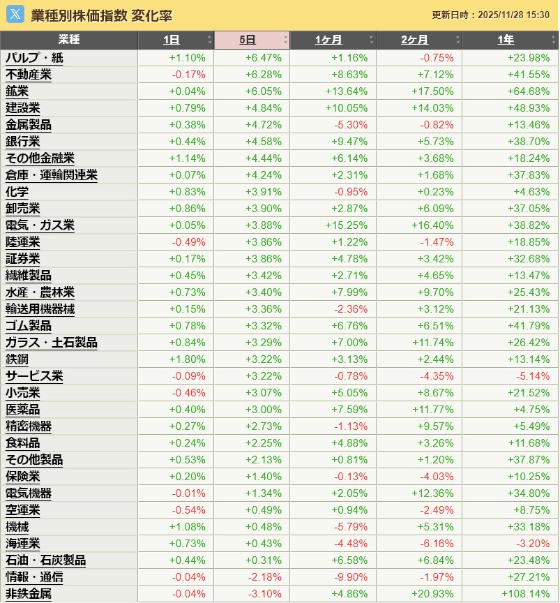 ちなみに先週の業種別騰落率は以下の通りでした。紙パルプって明らかノーマークってか出来高少ないセクターやしワイが手掛けることはないねんな。