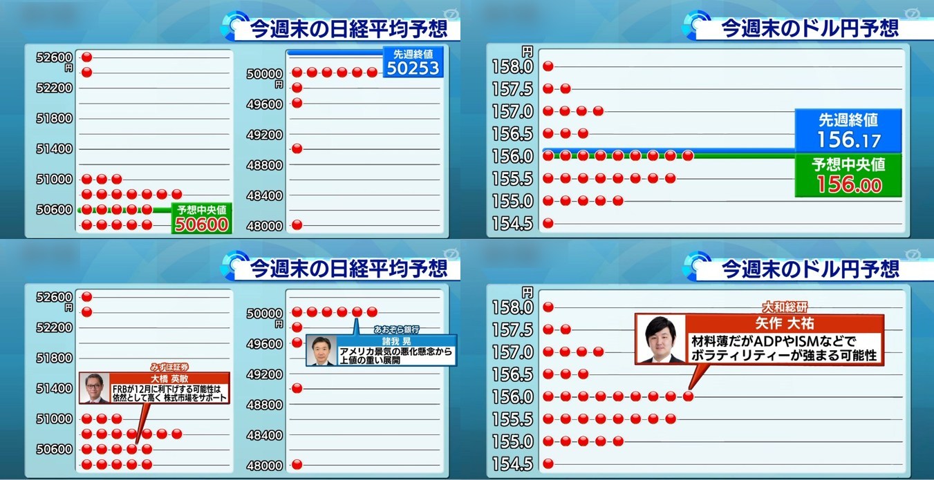 今月はやっとこさいつもの1日から始まる相場ですね。ボラも大きくならないことを願っています。メジャーSQがありますが、1日月曜日からですので12日ですね。機関がどう持っていくのか気になります。日本はそんなにイベントがないっすね・・・なんて考えながら、今週末の日経平均・為替のプロに寄る予想は以下の通りです。 ワイは「49800@155」と予想します。全く当たる気はしませんけどね・・・