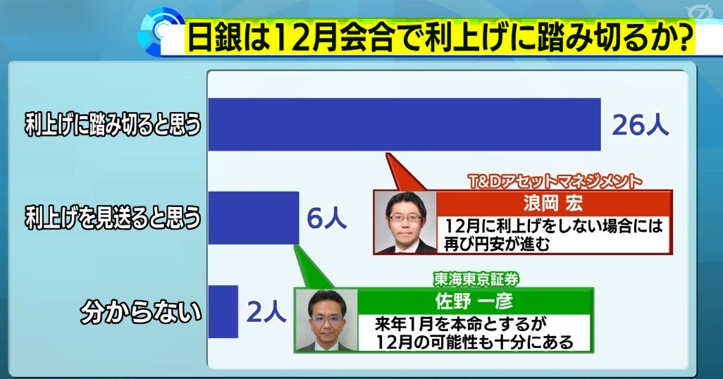 プロは12月利上げありとしてますね。これね・・・リークしてるっていうニュースがあったけどロイターだったかな・・・もし利上げを見送ったら、銀行株は大暴落するよ。どうなるのかワイもわかりませんが、ワイは利上げは無いと予想します。植田がやたらと春闘春闘って言ってましたからね。ワイも利上げしてもいいと思いますが、植田は慎重やで!前の植田ショックでこりてるからや。もしするなら、もう少しリークがあるはず・・・