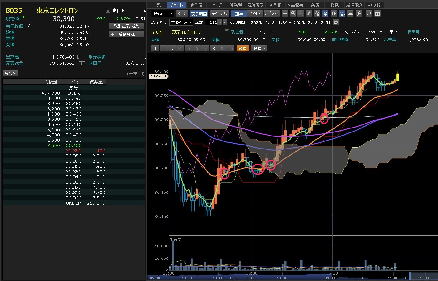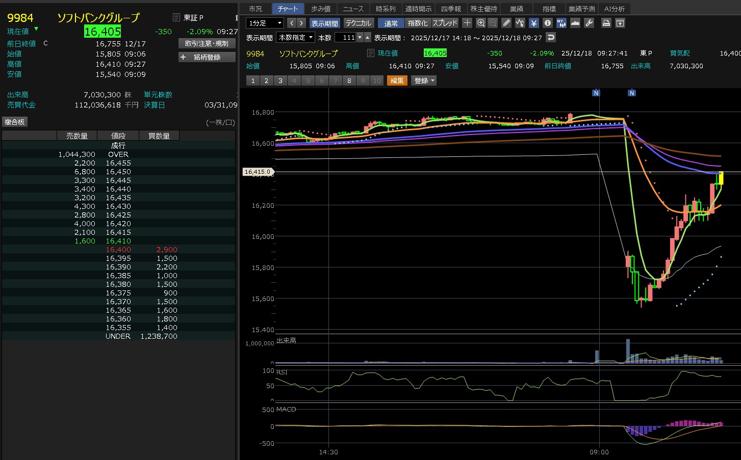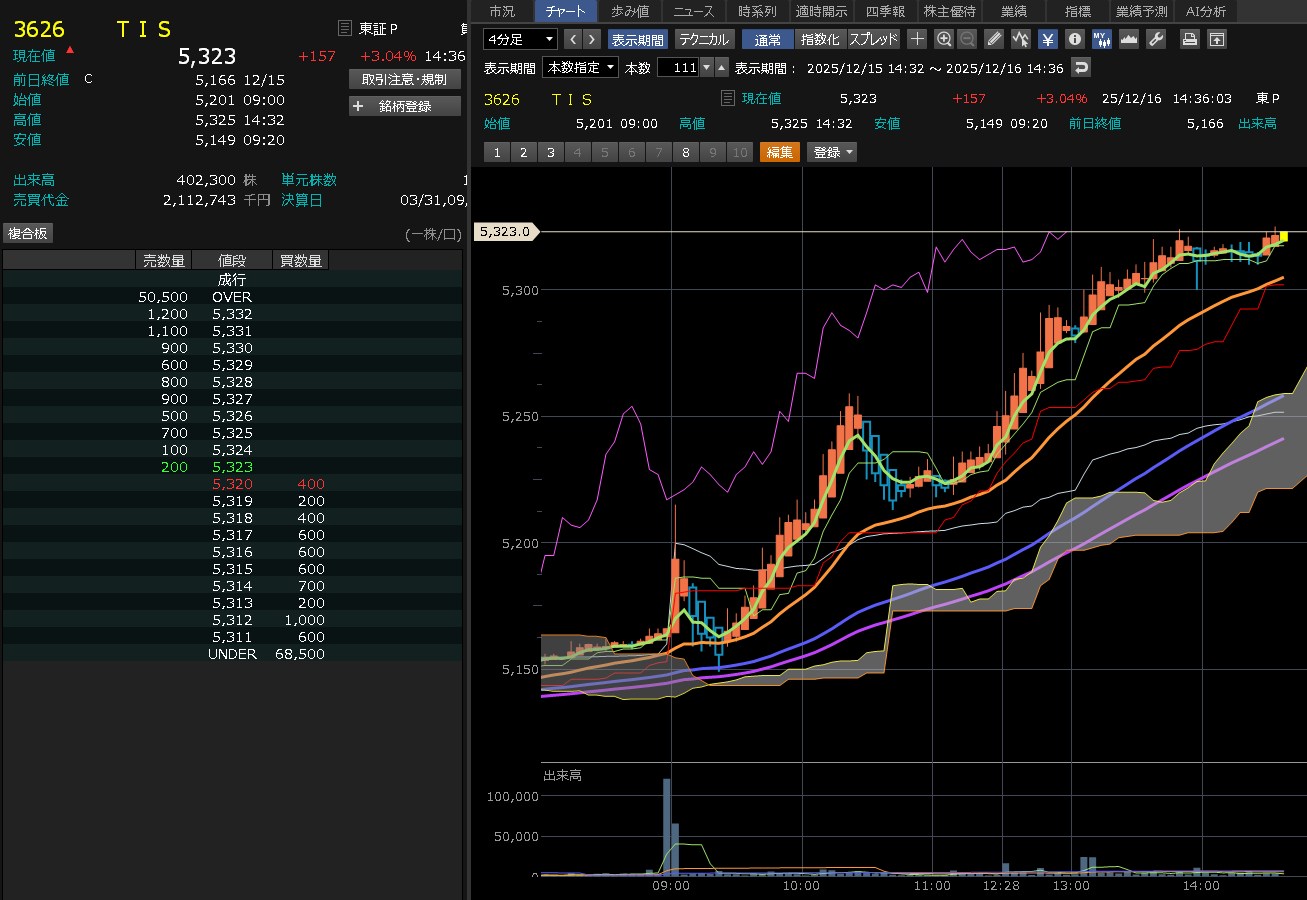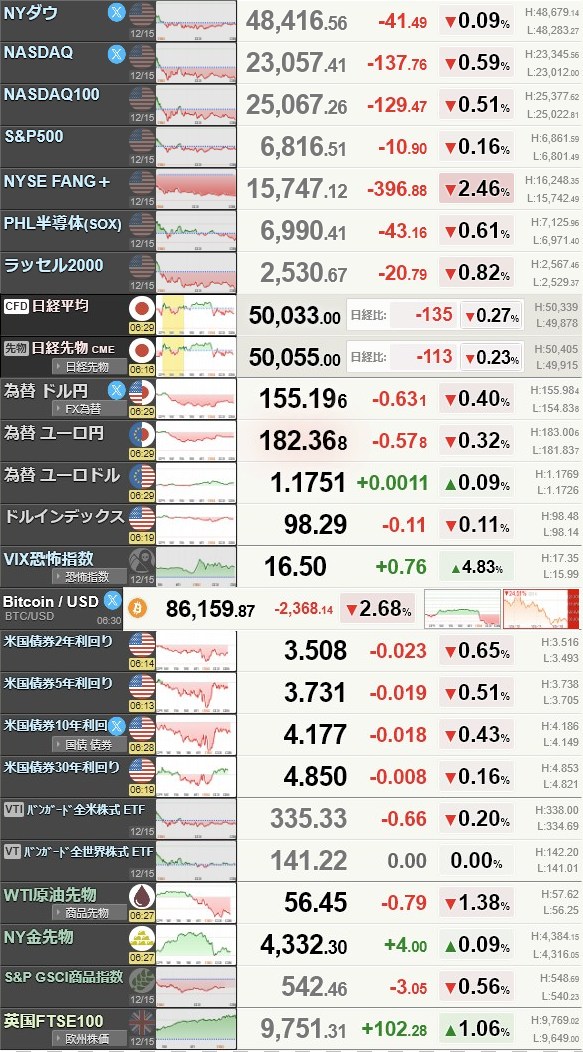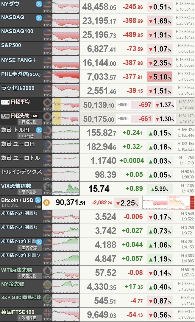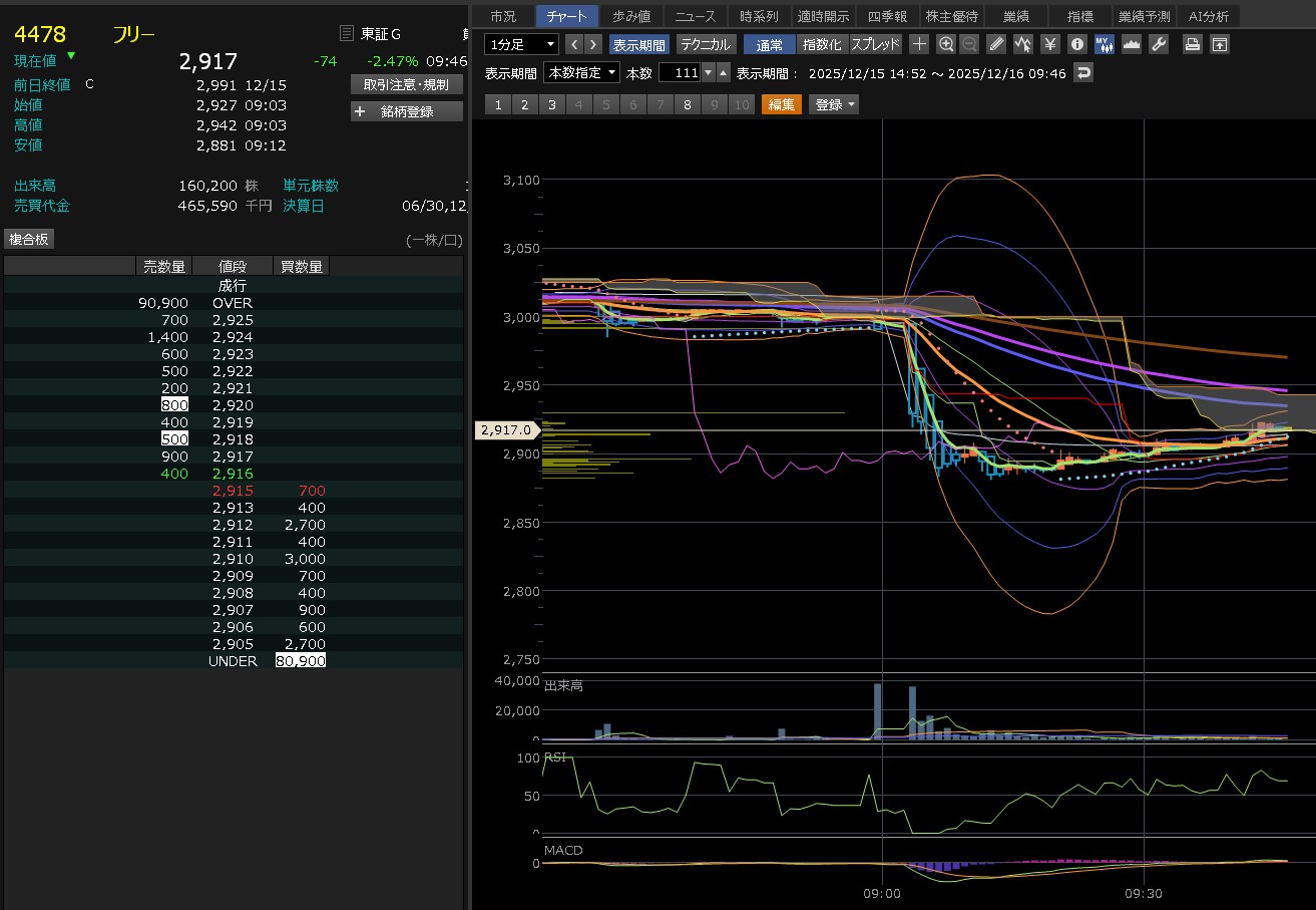 ブロードコムまで結構下げてAIに不安が広かってます。ただ、これは一時的なものだと思ってます。AIはまだまだこれからです。なので押し目は回でいいと思うけれど今日は弱いと思ってるってか、今年いっぱいは弱いと思ってる。だって、クリスマス休暇やん。ただ、短期で見たら、今日は押し目なのかも知れない。1000円下げは買い下がっても良いのかも知れない。