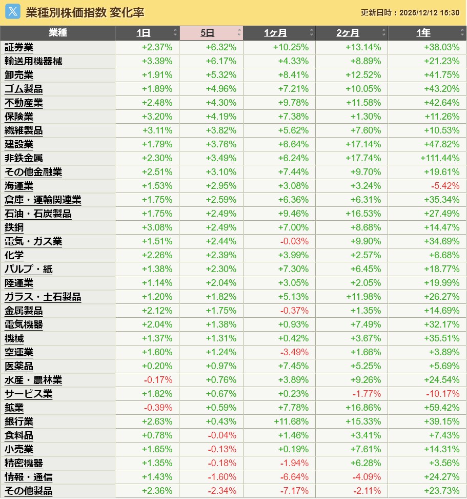 ちなみに先週の業種別騰落率は以下の通りでした。ジュニアNISA?違うな。NISA枠の年齢引き下げで証券業が強かったんかな?あとは自動車ね・・・それにともなってゴム製品ってところかな。ワイの住友ゴム・・・相性合わなかったな。