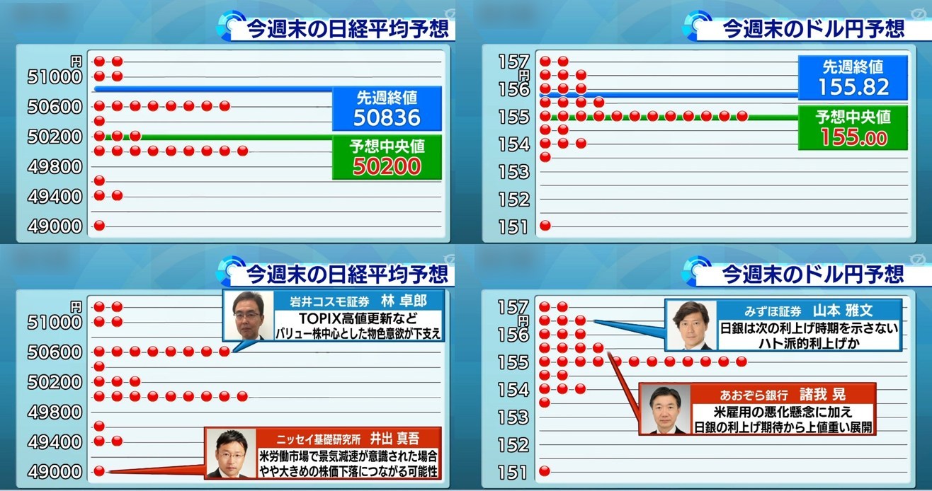市場は利上げ織り込み済みとやたら言ってるので、その逆をいくと思うんや。すなわち・・・金曜日はダダ下げってことやで!なんて考えながら、今週末の日経平均・為替のプロに寄る予想は以下の通りです。ワイは「49500@153」としますよ。まぁ当たらないほうが良いのですけどね。今週はイベント盛りだくさんやからどうなるのかさっぱりわかりません。