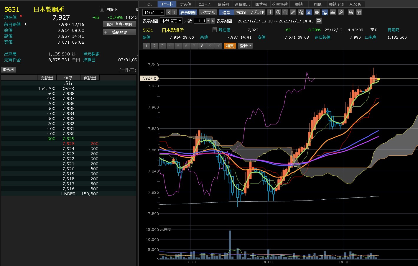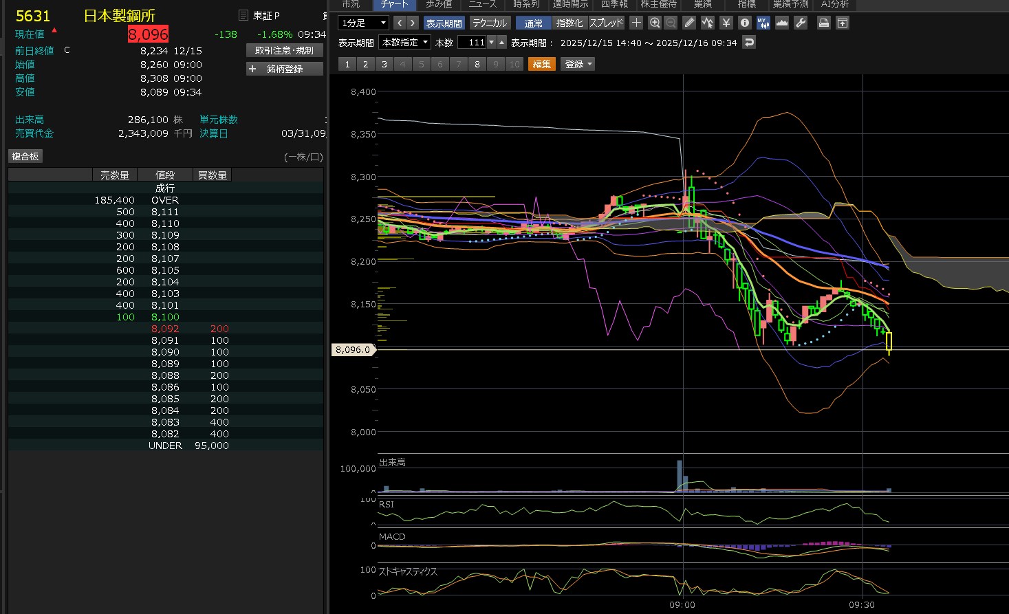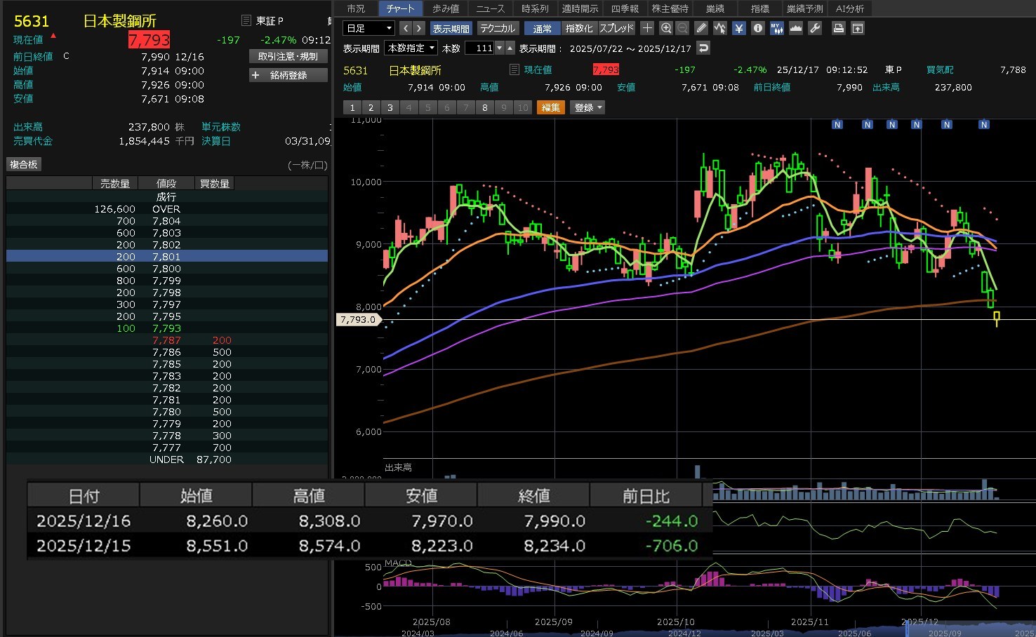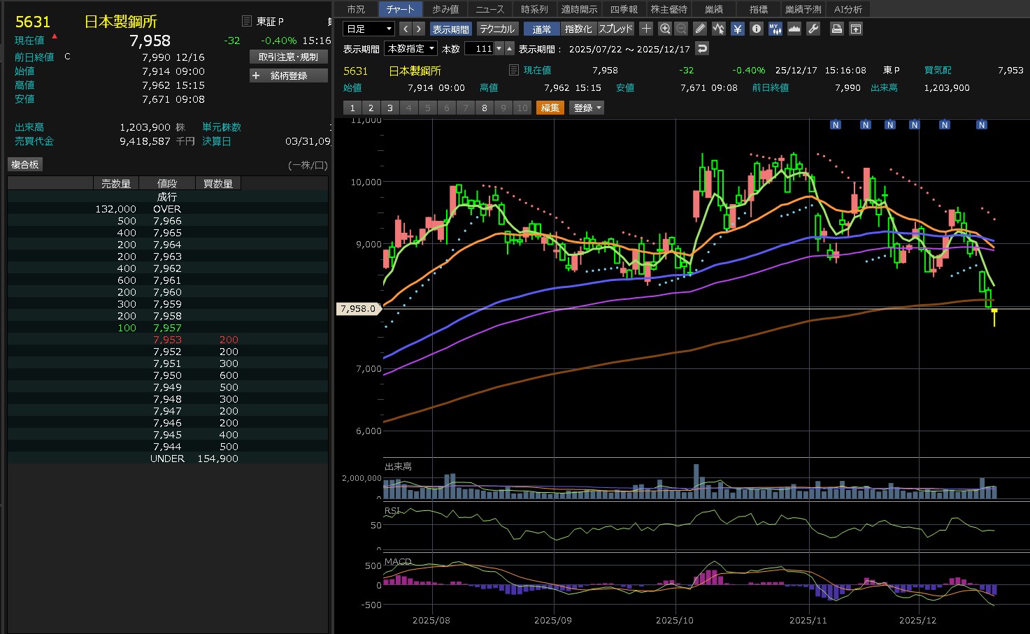 日足は下降トレンドやけど・・・どうなるやろうね。日本製鋼・・・にしても日経弱いな・・・