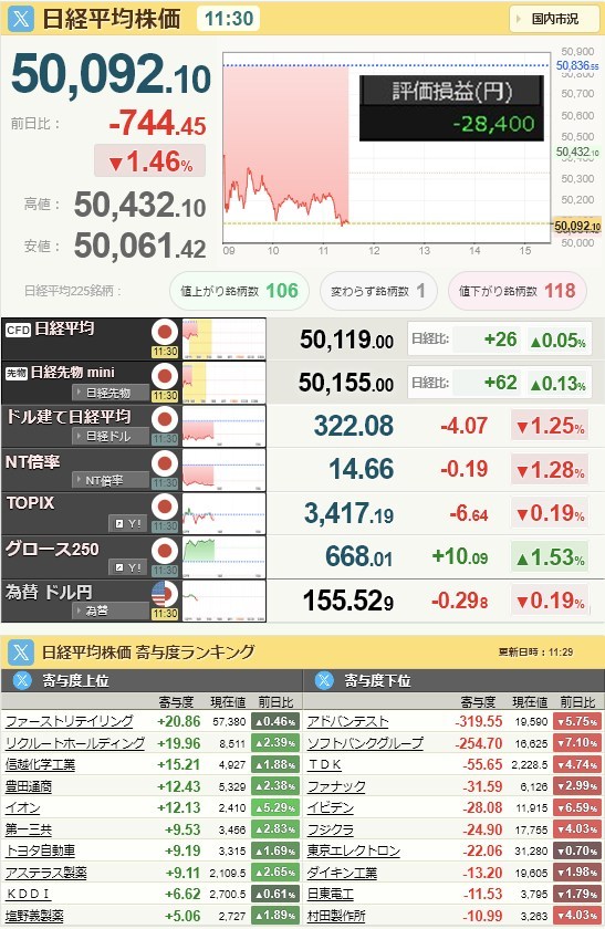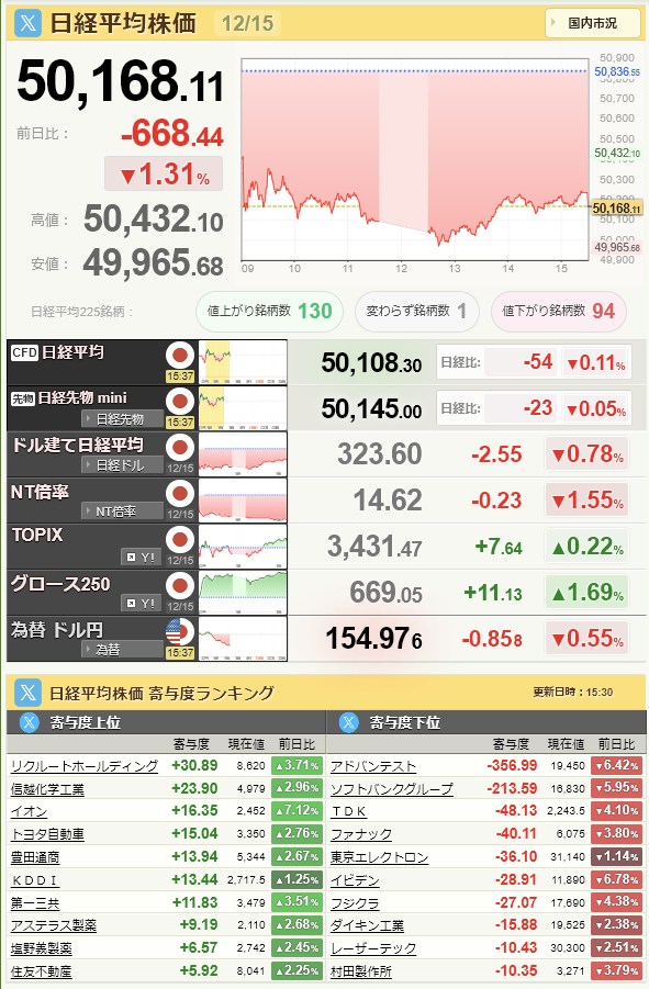 日経平均50,168.11-668.44-1.31%[15:45]米ドル/円155.08-0.73-0.47%[15:49]