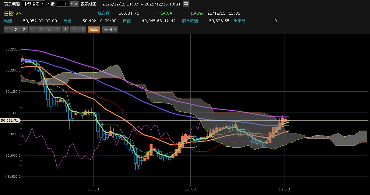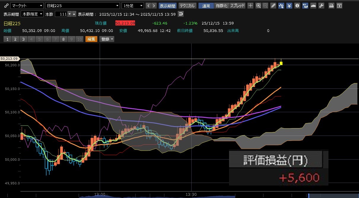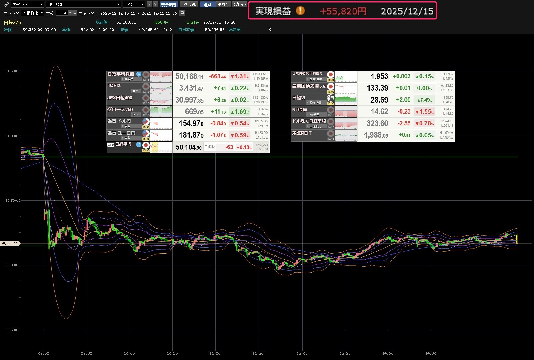 本日のデイトレ結果と日経平均の1分足は以下のとおりです。