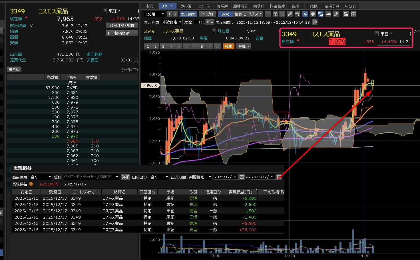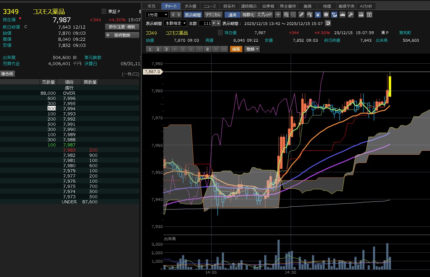 ワイが買った銘柄は今日は弱かったから・・・引けに買ったら良かったよ。それで良かったんや・・・引けに追加購入するかな・・・にしてもコスモス薬品@7995やで!ぐんぐん上げてるわ。って書いてたら@7997になった。まぁこうなると思ったよ。ホンマに多分8000は抜けるやろうね。知らんけど・・・