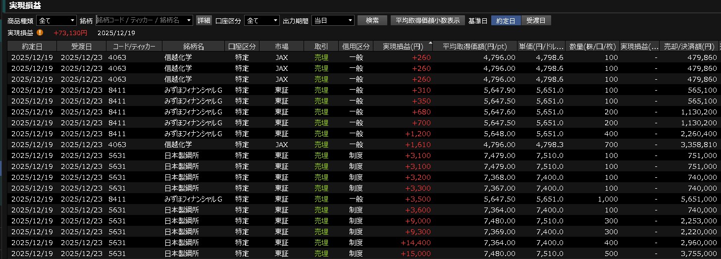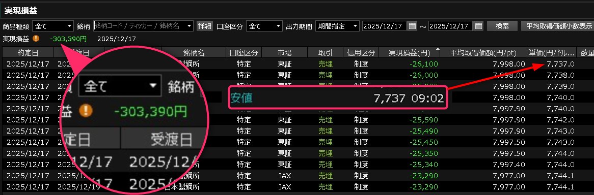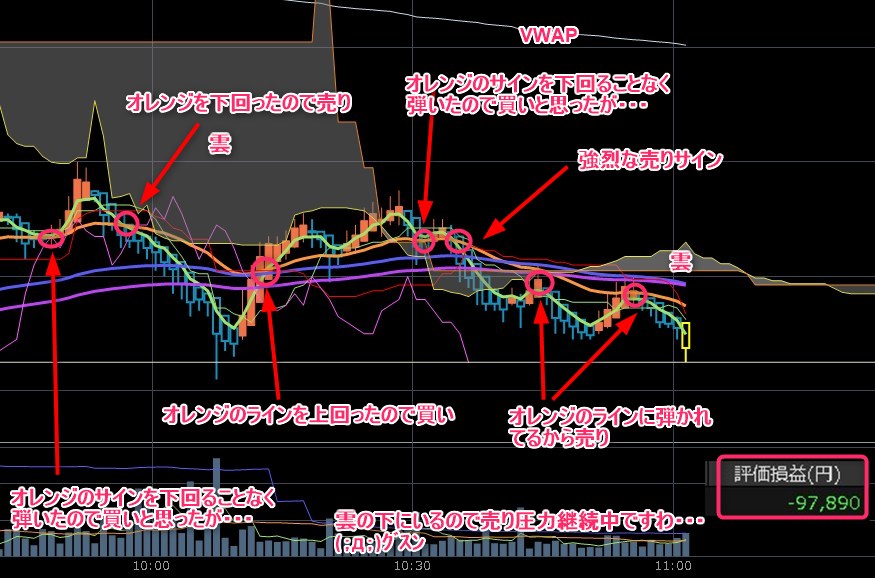 今日はなかなか・・・うまく乗れなかったな。前場で吹いたところをジャンピングキャッチしてはしごを外されてワイは宙ぶらりんで見てるだけでした。ここでロスカットできたら強かったんですけど・・・いつも買い物に行ってる好きに下げるのは辞めて欲しいわホンマにね・・・ただ今日はプラスで追われたんやで・・・運が良かったありがとう・・・(´;ω;`) ワイの取引は以下のとおりです。