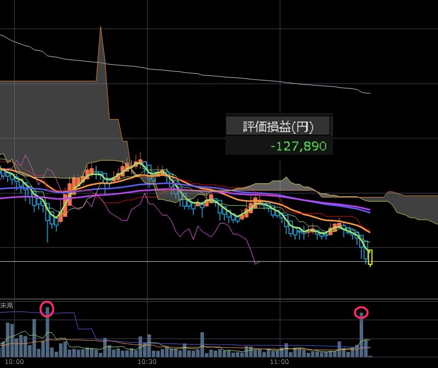 ワイも含み損になったわ・・・そして10:31に日経もやや下げがあったから・・・( ´・ω・)y-~ エト…噴かへんかな?それを待ってるんやけど・・・売ったほうがええんかな。まぁまだまだ時間があるしね。前場はちょっと厳しそうや。雲の下にあって、線もクロスしてるし、これが上向くまで、追加購入は無し・・・様子見です。