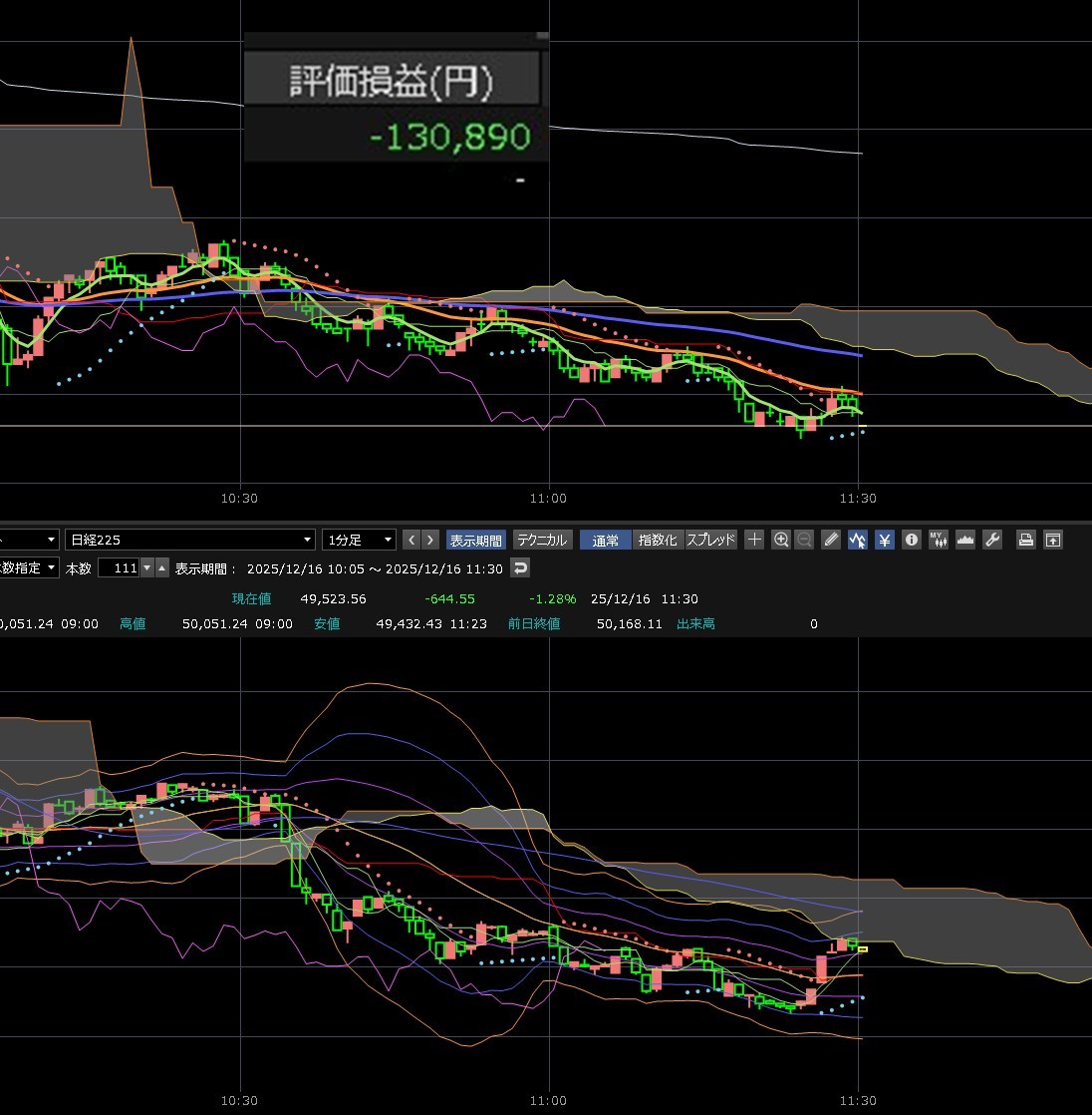なんかもうどうでも良くなってきました。日経につられて下げすぎです。ってか11:20に安値って完全に日経に連動してるやん。あ、また下げた。前日比マイナス13万円。